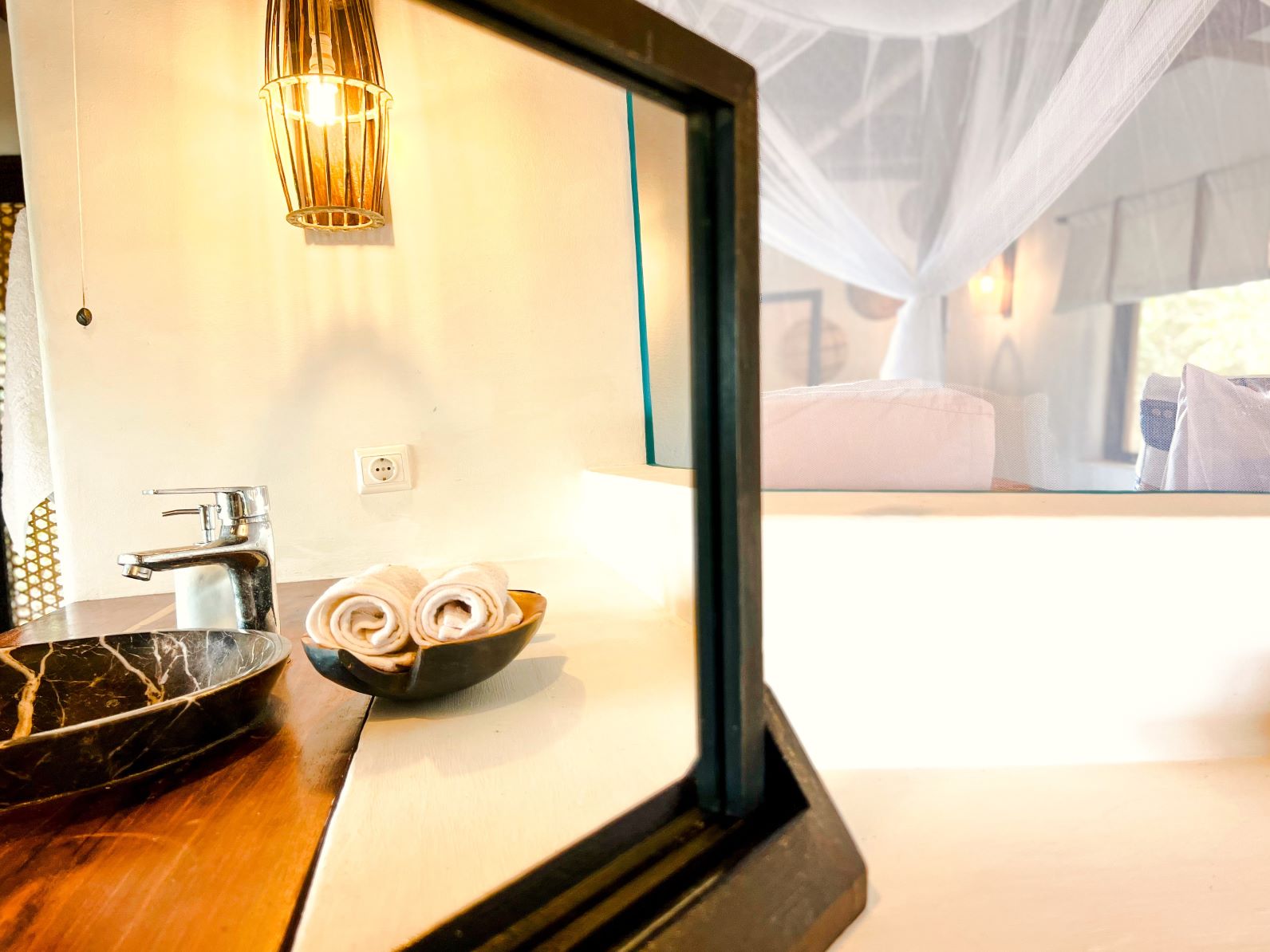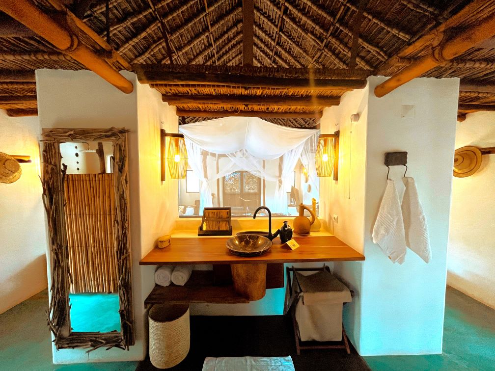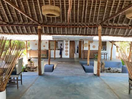 The beach bar and restaurant are separate communal areas where simple, open-plan designs and comfortably furnished seating areas create an ultra-relaxed atmosphere. The beach bar has a large open-sided deck with a colourful mural. Next to it is a small curio shop and the massage room with a desk where activities can be arranged. A 10-minute walk away from the beach bar, on a small piece of coral/rock peninsula, is the lodge restaurant. It is spacious and open with a high thatched roof and stone floors.