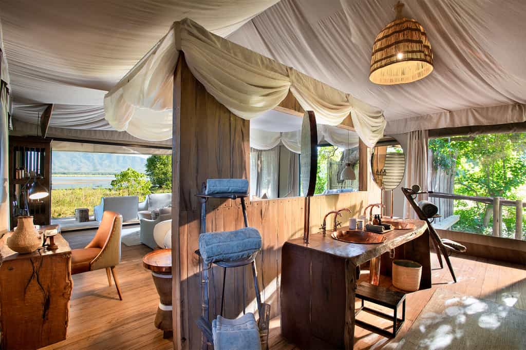 Intimate Nyamatusi Mahogany has just two double tents and two family suites, each tucked discreetly into the forest. Double rooms have king-sized beds and large foldaway screened doors that open out to an L-shaped deck, with built-in sofas, a plunge pool and an outdoor shower. Behind the living area is a spacious bathroom with double vanity, shower and deep bath. Family suites have similar facilities, but include another en-suite room, accessed from outside. The decor is discreet; the views sublime.