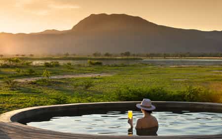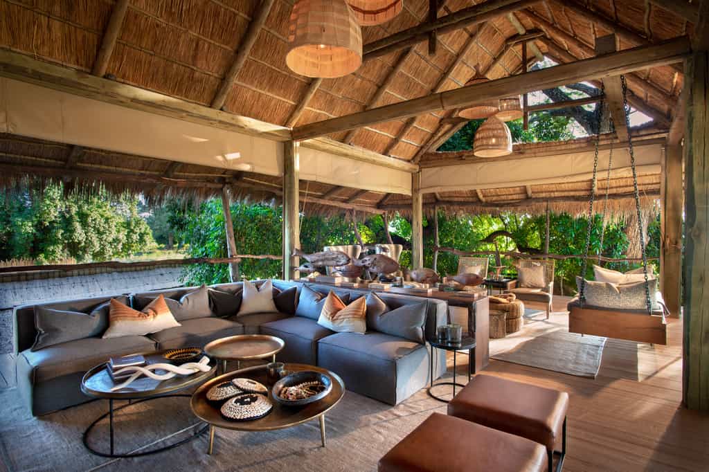 The double-decker, open-plan main area has a treehouse atmosphere, with loads of wood and thatched roofs, and a fabulous hanging daybed. Every corner reveals broad views of the river and floodplains, and the wildlife they attract, from mammals to birds. On the lower level is the dining area, with a U-shaped counter surrounding a wood-fire pizza oven and, outside, a deck with seating, a fire pit and pool. Upstairs are the sociable bar and a few intimate sitting areas.