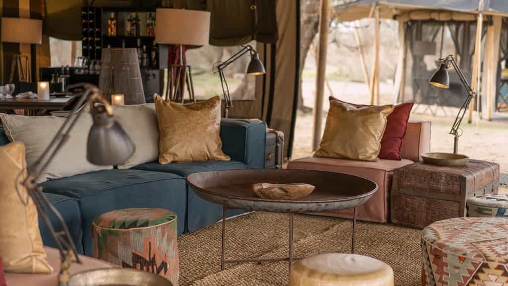 Amongst the hilly kopjes of Kogatende and settled beneath a canopy of acacia trees, the camp is divided into two. Each has its own main area – a canvas lounge and mess tent with a no-fuss bar area. Open-air lounges may be arranged outside to make the most of the views or the crackle of the fire at night. The structures are simple, but there's no lack of finesse. You'll dine and lounge in rustic elegance, with white tablecloths, plush sofas and textured African rugs. Lantern-lit evenings exude the romance of old-school safaris.
