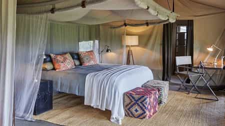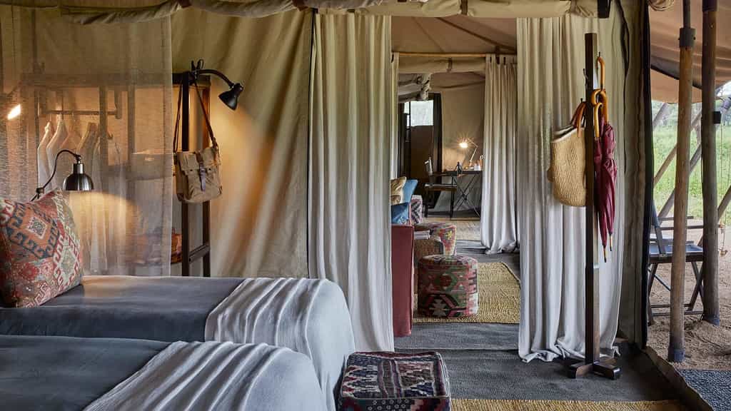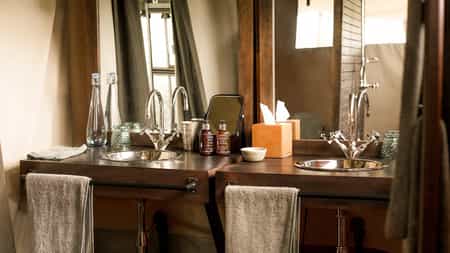 While capitalising on the action, you'll be glad to disappear behind the tent flaps for a rest. The tents are roomy, with a choice of comfortable twin or king-sized beds and the possibility of an extra twin bed. Your en-suite bathroom has a flushing toilet and on-demand heated bucket showers to wash off the Serengeti dust. The atmosphere is undoubtedly romantic, with white netting shrouding the beds, crisp white linens on mattresses that guarantee a well-earned sleep, earthy rugs, and wide views from your furnished veranda.