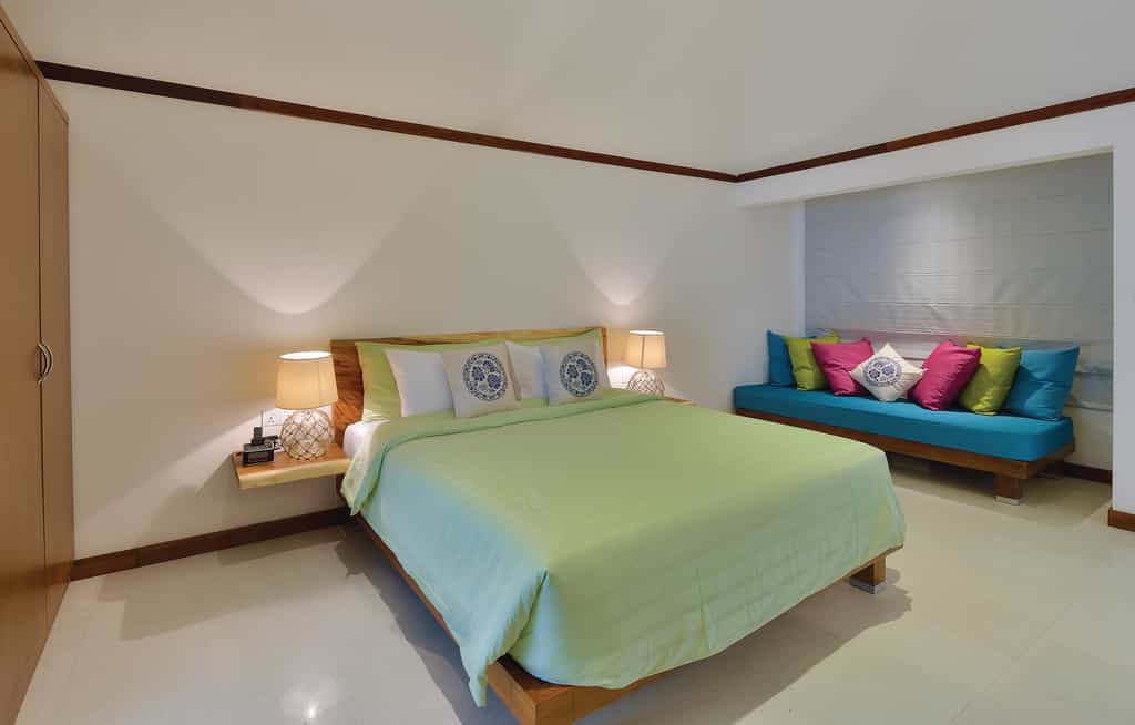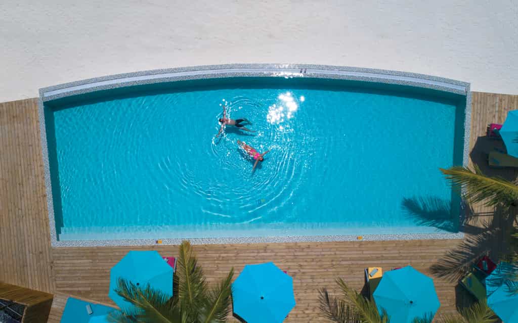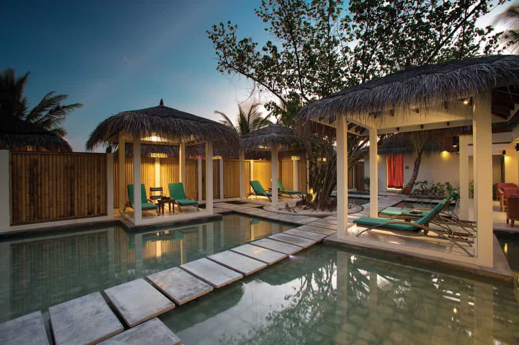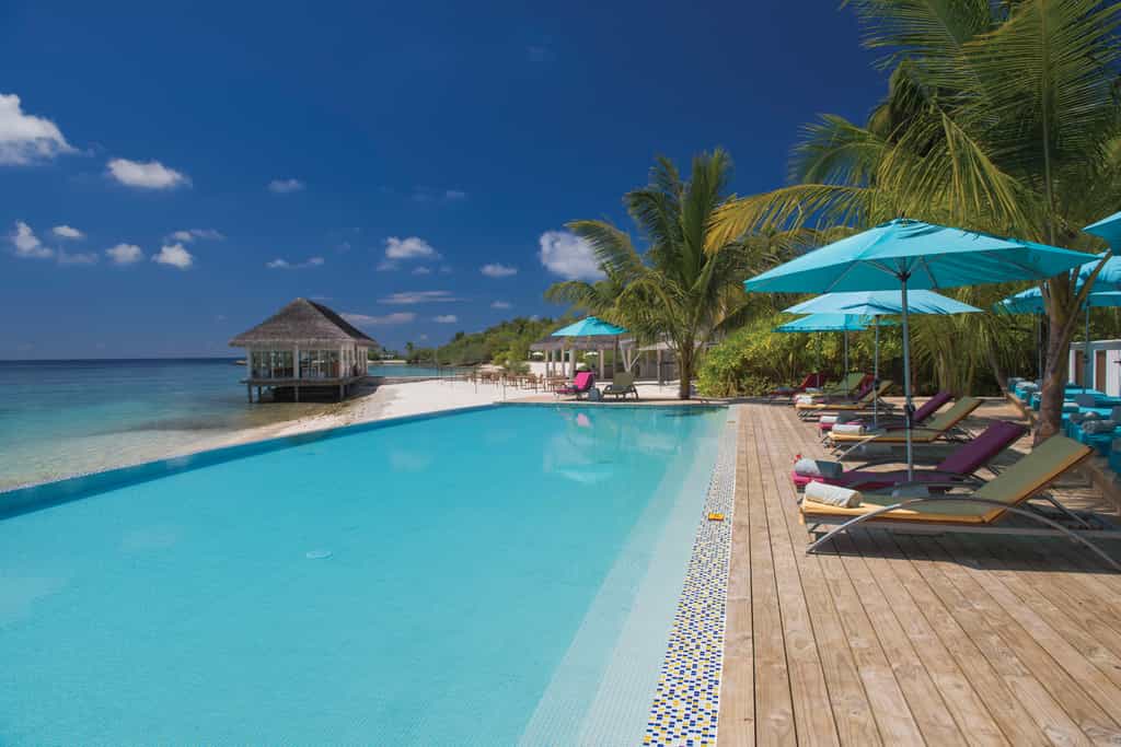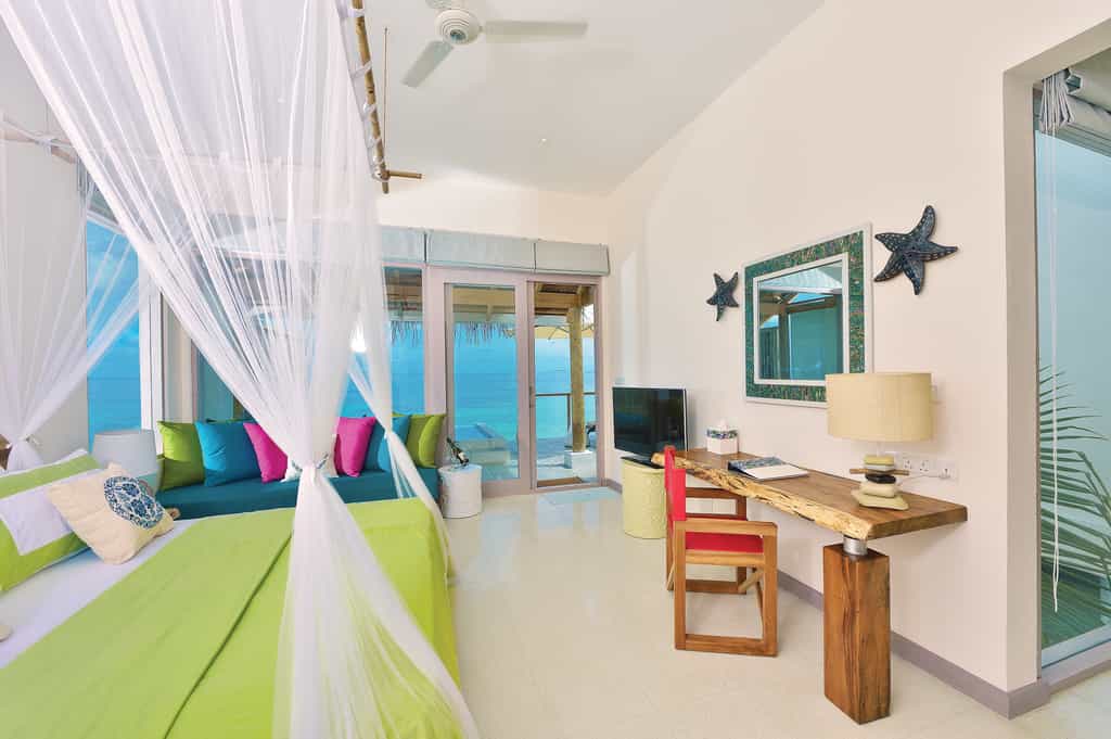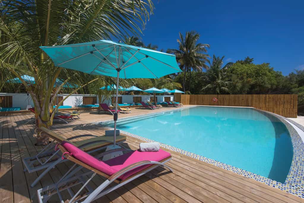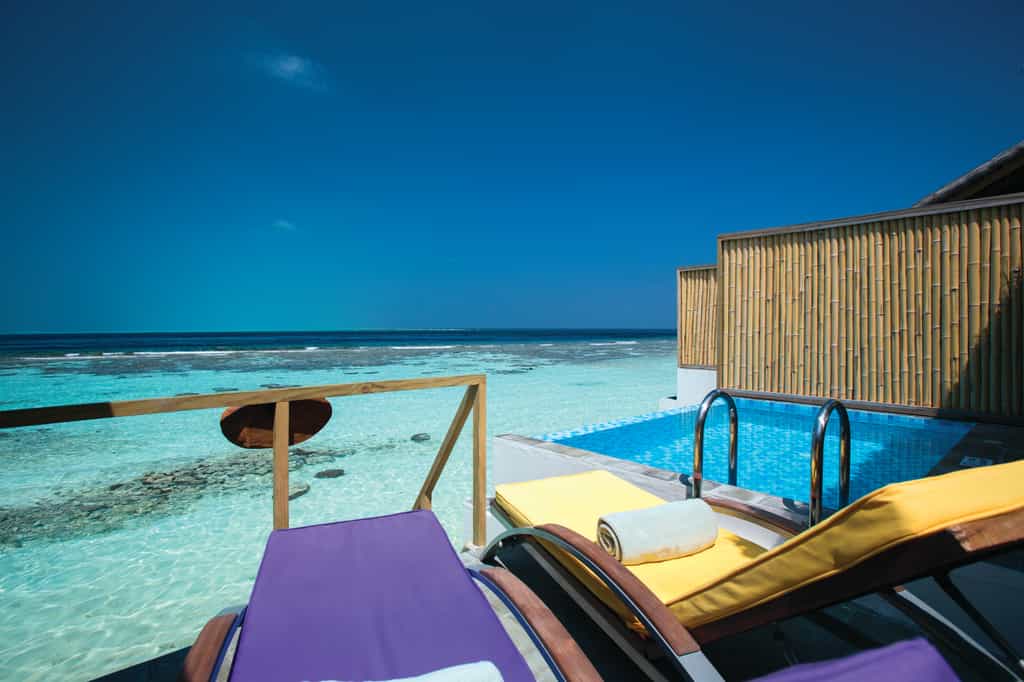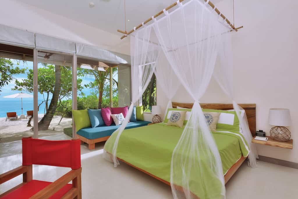 OBLU has quite the selection of villas, built above the lagoon (with easy access to the water) or along the beachfront. Each villa comes with a king-size bed, a cushioned window seat in blues and pinks, and little beachside touches like star fish lamp shades. The deluxe beach villas have a veranda with a daybed and an open-air bathroom with a rain shower. There is also a two-bedroom suite with a large pool, outdoor entertainment area and loungers set on the sand.