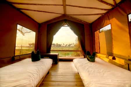 Thirty guests can be accommodated in 15 simple dome tents (including two family units and one honeymoon suite). The tents - perched on raised wooden decks and shaded by canvas - are just large enough for a double bed (with a mosquito net) and a storage chest. Each has an outdoor bucket shower and an ensuite toilet. A charming reed and thatch hut constitutes the honeymoon suite with otherwise similar facilities.