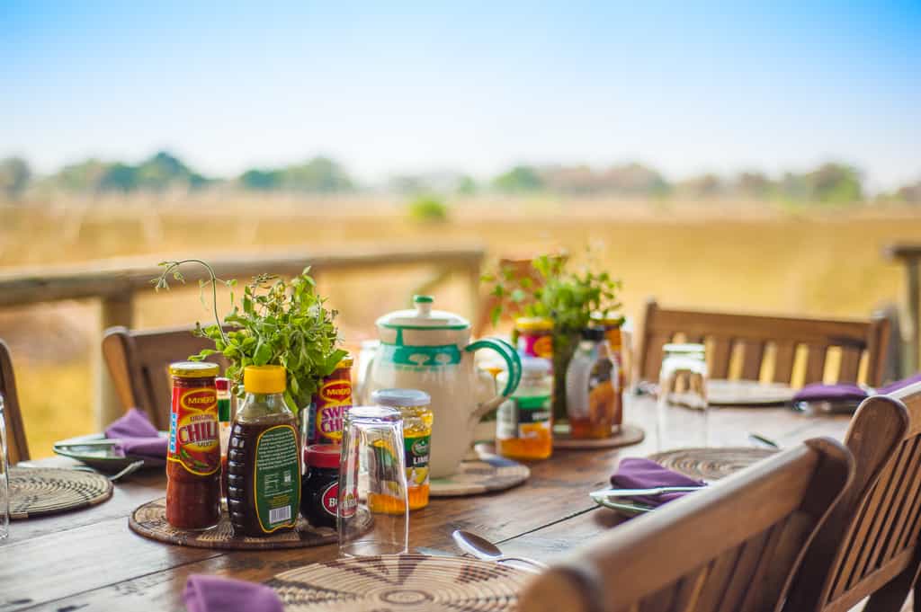 The main area is an open-sided wooden deck comprised of a couple of different sitting areas with comfortable chairs and couches, a small, funky bar that makes good use of an old mokoro, and a communal dining table. Some parts of the deck are shaded by roofs of wooden poles, while others are open to the sky. The decor is simple but comfortable and the area has beautiful 360 degree views of the surrounding swamps.