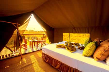 There are five "mini-Meru" tents that sleep a maximum of ten guests. Each is raised on a wooden deck and has its own small, private balcony with superb views and a couple of camping chairs. Inside, there are either two single beds or a king, and a luggage rack. Each room has its own bathroom a few metres from the back of the tent. They are equipped with a flush loo and a clever bucket shower - with hot water!
