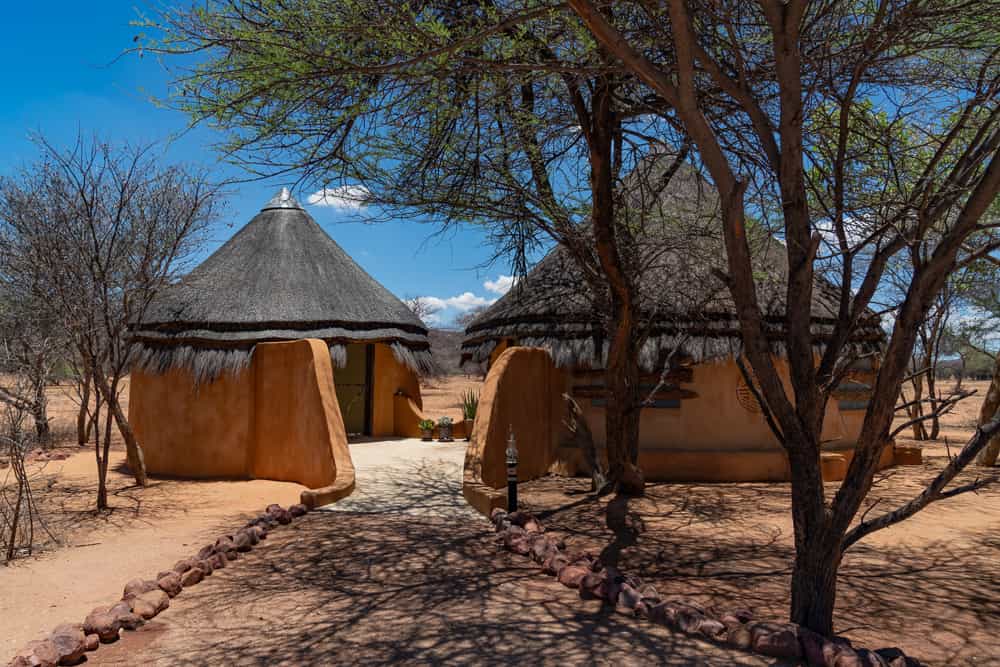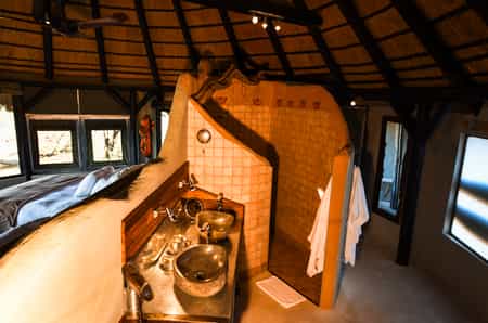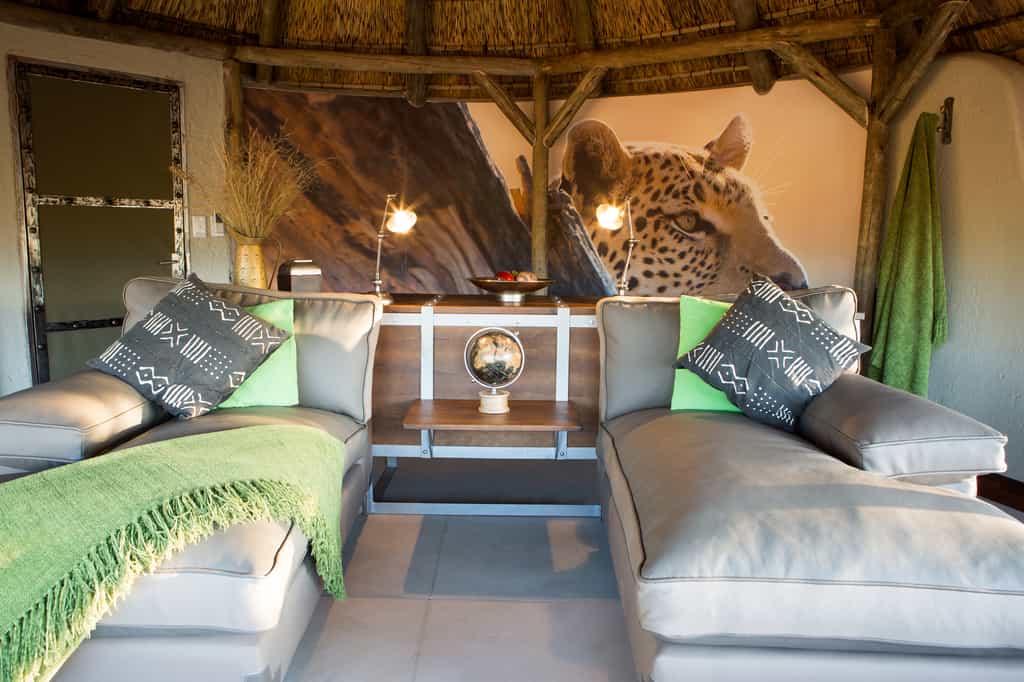 There are eight double chalets and one honeymoon chalet at Okonjima Bush Camp. Each of the stone and thatched roof chalets has a wide canvas wall which can be rolled up to reveal a 180 degree panoramic views of the surrounding bush. There are ensuite showers, ceiling fans and AC, a lounge area, mini bar/ fridge and in-room telephones. They are decorated in rich African colours and natural materials have been used throughout.