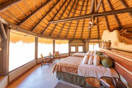 With just eight chalets, guests at Okonjima Bush Camp are assured of a personalised experience. The decor and design, clay and thatch open-fronted chalets and main areas, is atmospheric and warm with an abundance of rich African colours, textures and artwork. Days will be spent exploring the Okonjima reserve either in 4x4 vehicles or on foot. We would recommend a 2 night stay here to ensure you are able to tick off all the educational and excellent activities on offer. Children over the age of 12 years are welcome.
