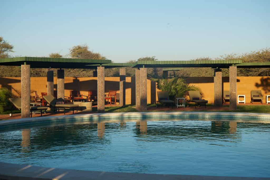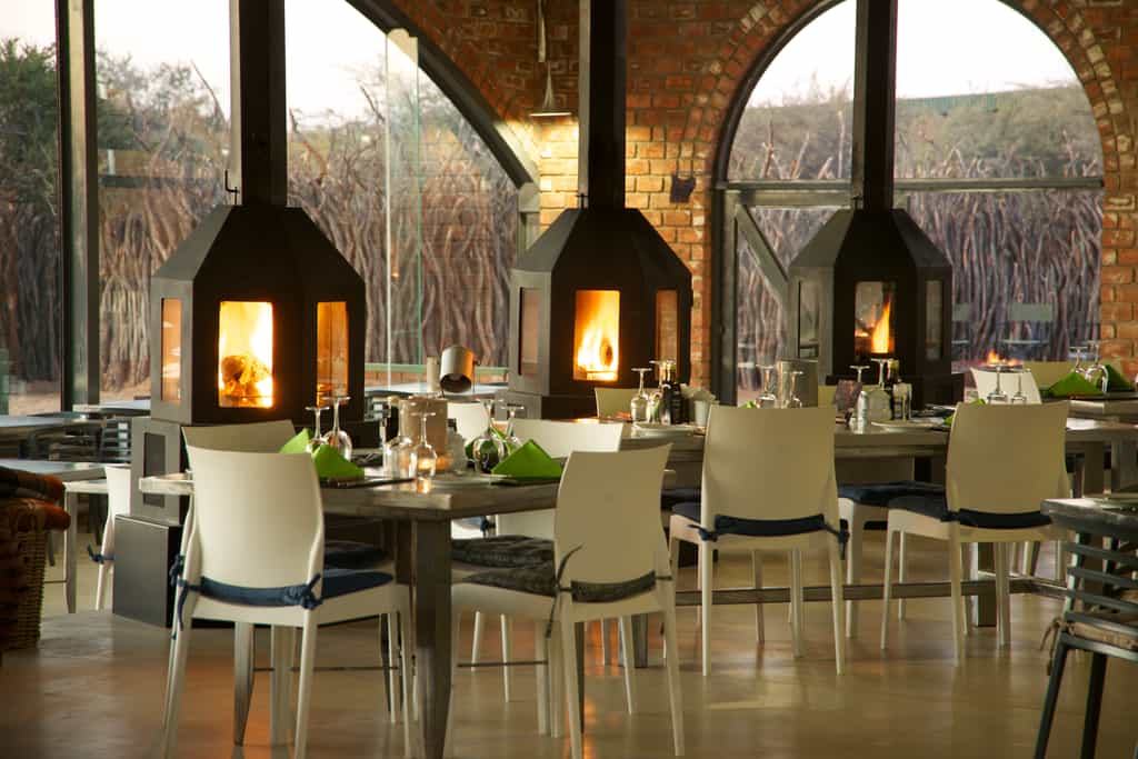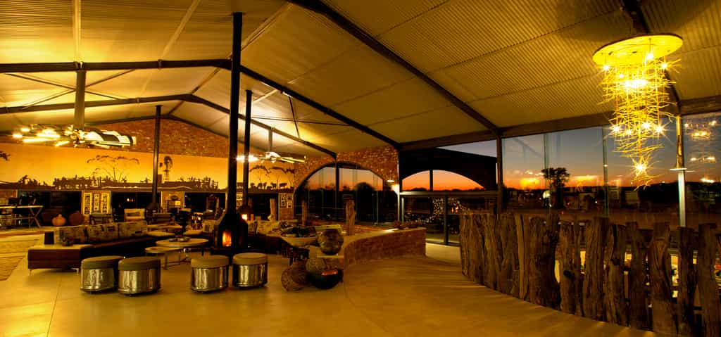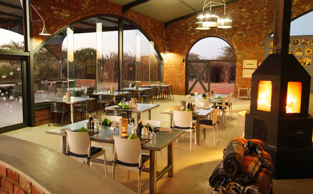 The main area is fondly referred to as the 'Barn'. With its high ceiling, exposed brickwork, polished concrete floors and floor-to-ceiling glass frontage, it has a very contemporary and open feel. There is a reception, bar, curio shop and restaurant with plenty of tables inside and outside, where it is split level and has lovely views over the waterhole and plains. Whilst it doesn't have the immediate intimacy of the smaller camps on the Okonjima reserve, there are little personal touches like framed family photographs. Out front, there is a large pool for washing off the safari dust.