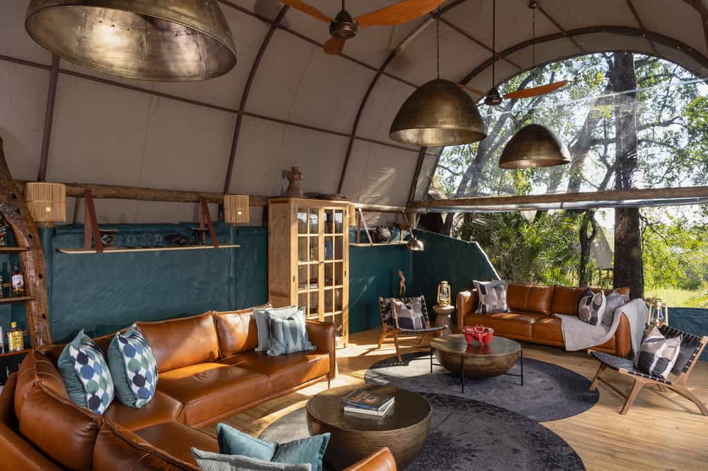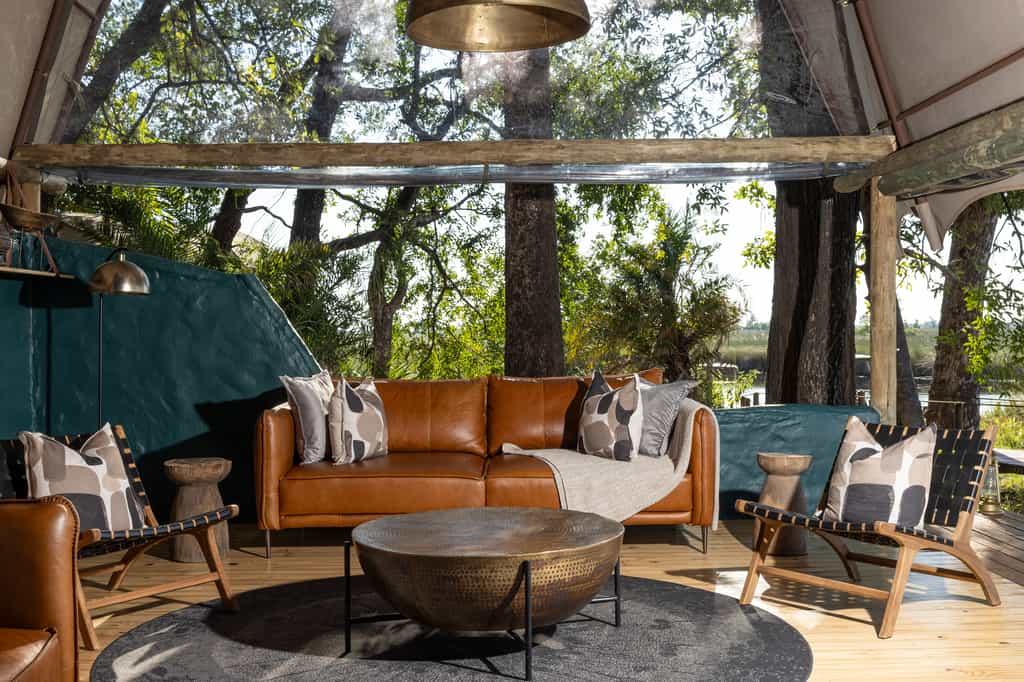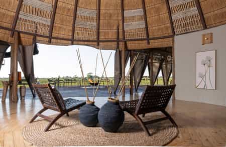 Okuti Camp’s main areas flow one into the other. The reception area, with its domed thatch ceiling, leads to a long area equipped with a dining table and comfortable chairs (the meals are highly recommended). Around the corner, the lounge's leather wrap-around sofa and armchairs beckon you to relax. The decor throughout is tasteful, eclectic and, above all, African. Outside, a fire bowl surrounded by comfortable fold-out chairs makes for convivial evenings. There's a swimming pool to plunge into at the end of a safari.