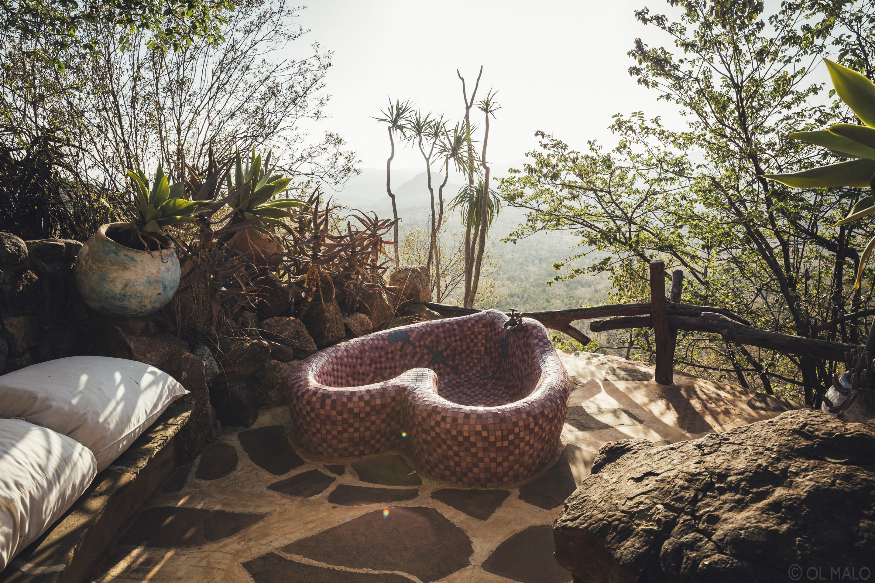 Ol Malo Lodge's main guest area is a striking blend of natural stone, olive wood and thatch set into the escarpment, which drops away steeply into the densely wooded valleys below. The huge lounge, bar and dining area faces the shaded sun terrace and infinity pool flanked by lush lawns and indigenous gardens. The atmosphere is homely and relaxed, with colourful Samburu artefacts throughout. Below is a waterhole that's visited by leopard, elephant and everything else with four legs.