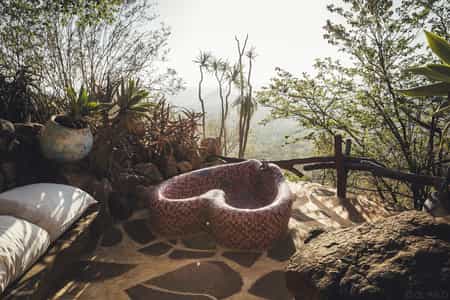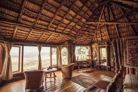 Stone pathways wind from the main lodge to the four rock-and-olive wood cottages along the edge of the hillside. Each is completely private, with glorious views from the veranda and the huge picture windows facing Mount Kenya. These romantic cottages, which are roofed with thatch, are furnished with vast cedarwood beds, original hand-carved Samburu artefacts, rich natural textures, plenty of space and a truly authentic African feel. The en-suite bathrooms feature unique free-form stone baths.