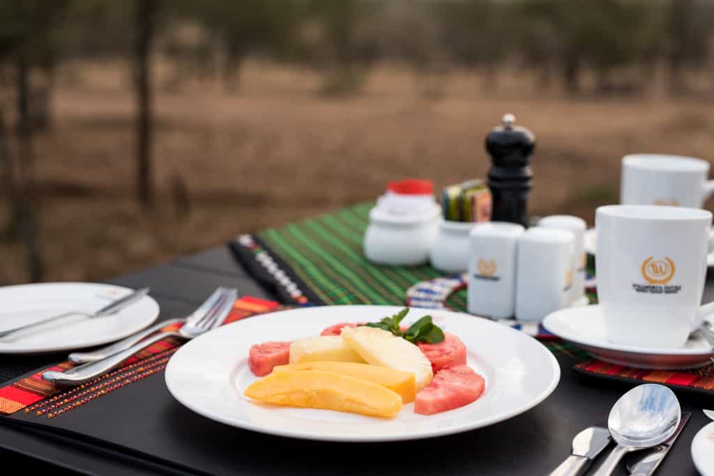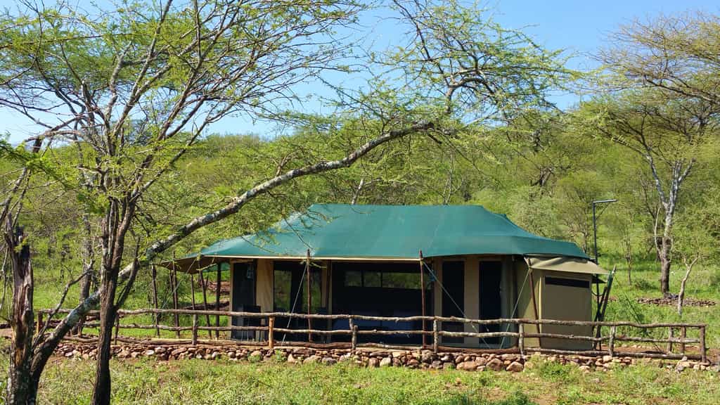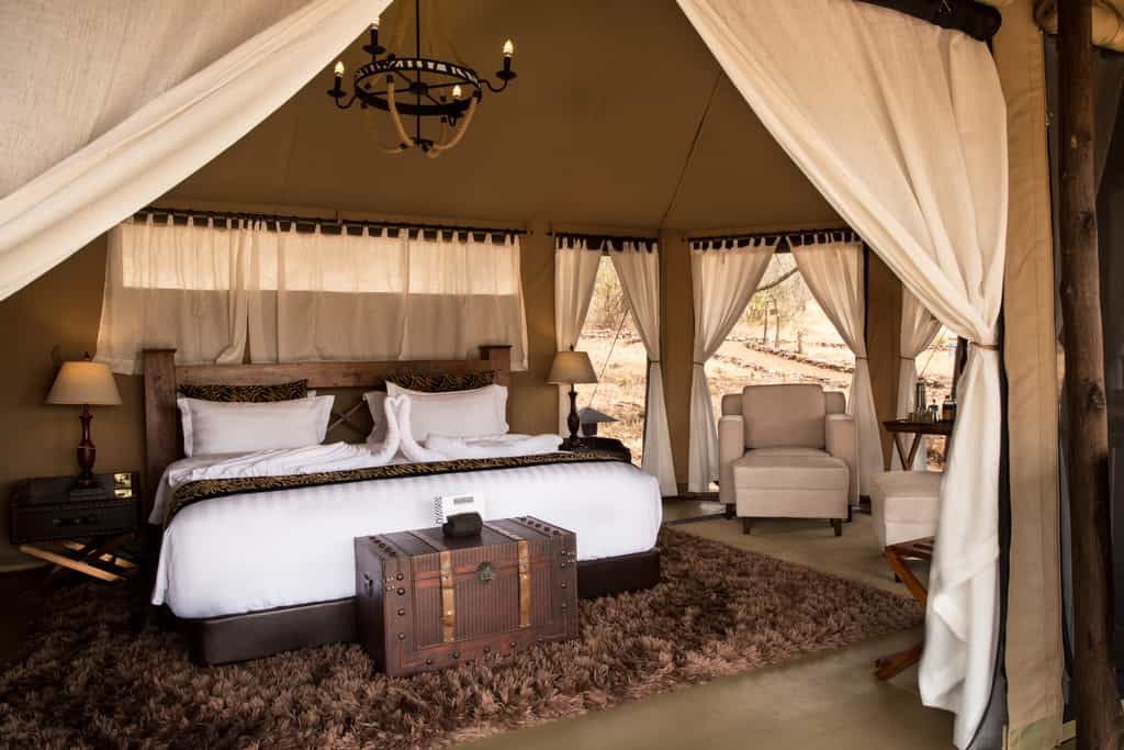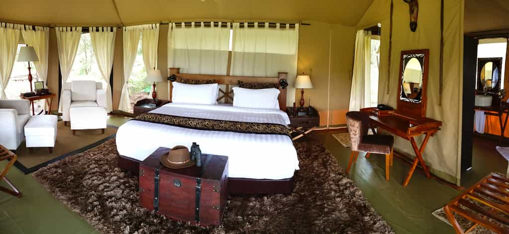 Nineteen luxurious tents (14 doubles, four twins and one large family suite) have lovely panoramic views, interrupted (unfortunately) only by the neighbouring tents. In the centre of each room is a king-sized bed surrounded by a couple of armchairs and a writing desk. The en-suite bathrooms have flush toilets, basins and showers with good water pressure. A shaded veranda wraps around most of the room – a great place to shelter from the heat and take in the action.