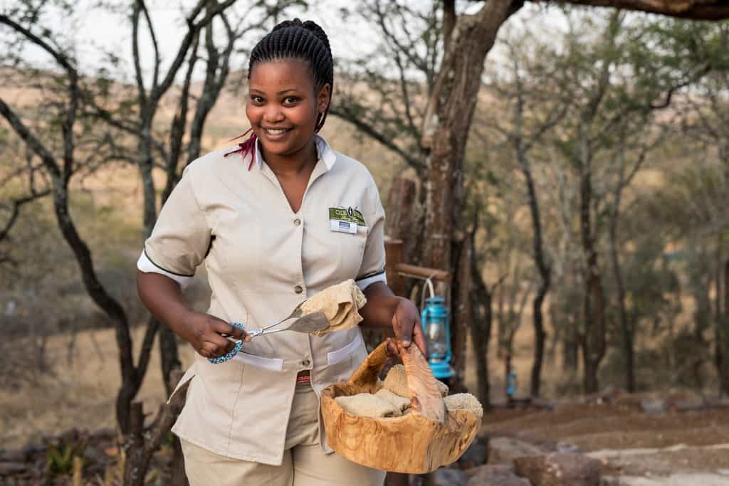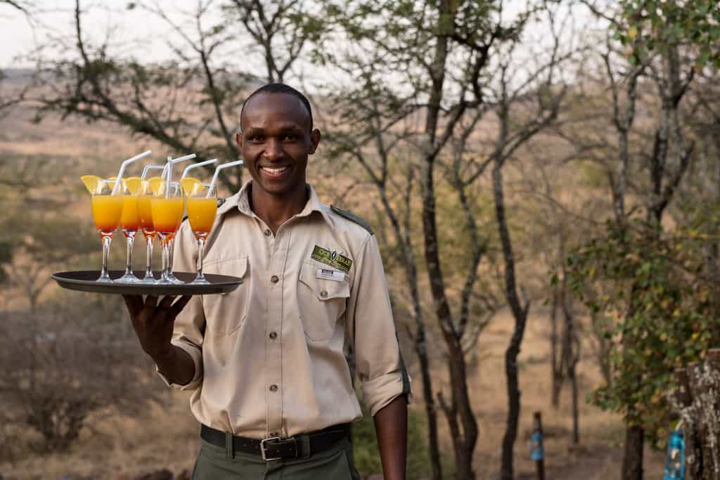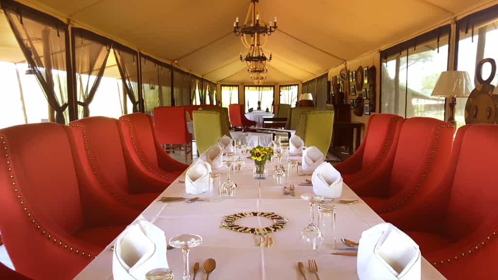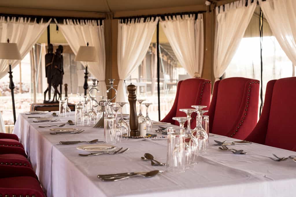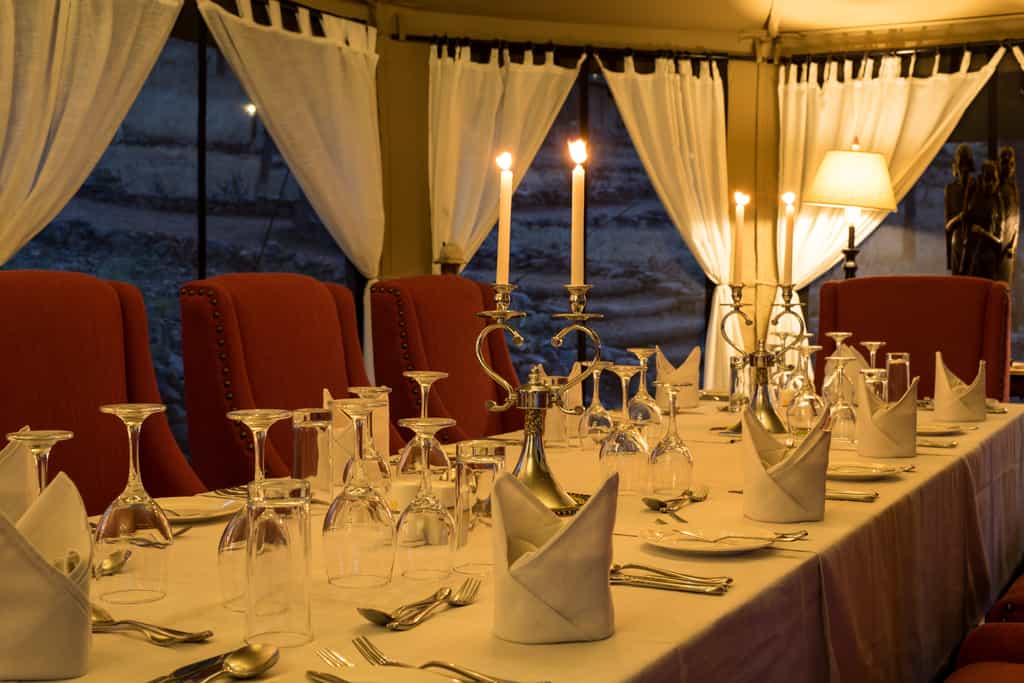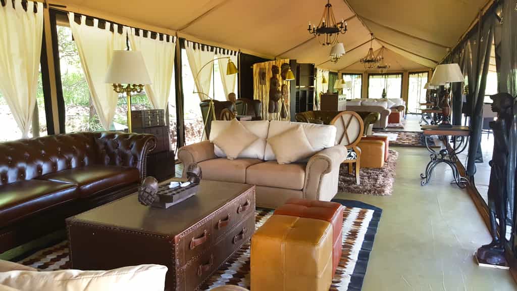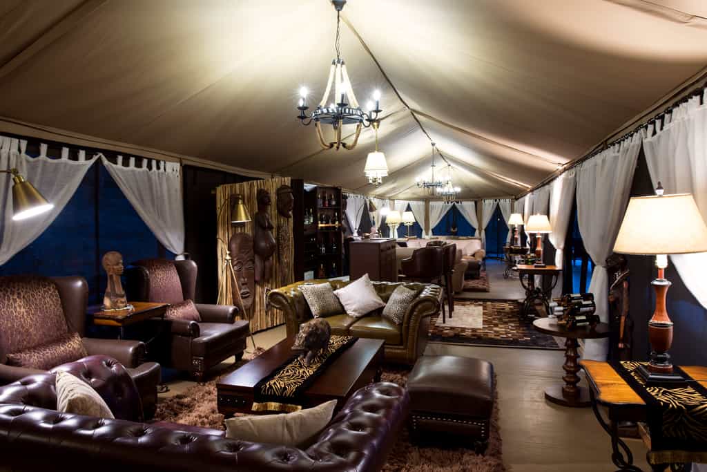 The spacious lounge offers several different seating areas, so there's plenty of space to chat, read or enjoy a tête-à-tête. The armchairs and sofas are of plush leather and canvas, tall lamps cast pools of light, and local wood carvings dot the space. Meals (expect the best) are served in the dining tent, with its romantic white drapes. After dinner, retire, aperitif in hand, to the open-air fire for convivial chats and, maybe, a Swahili lesson from the camp staff.