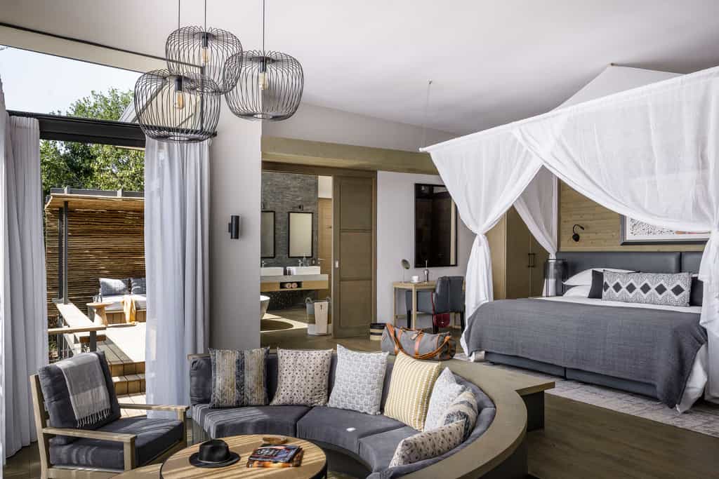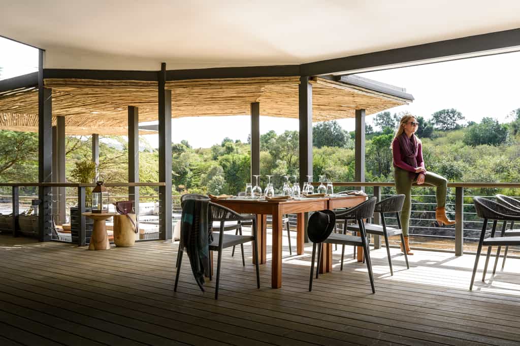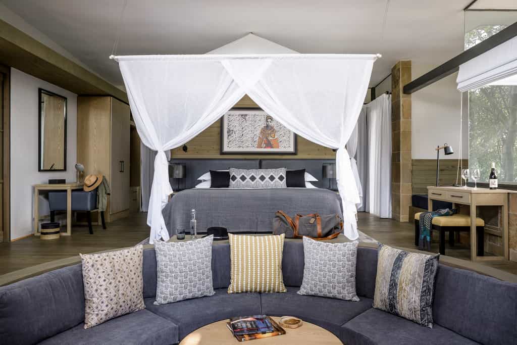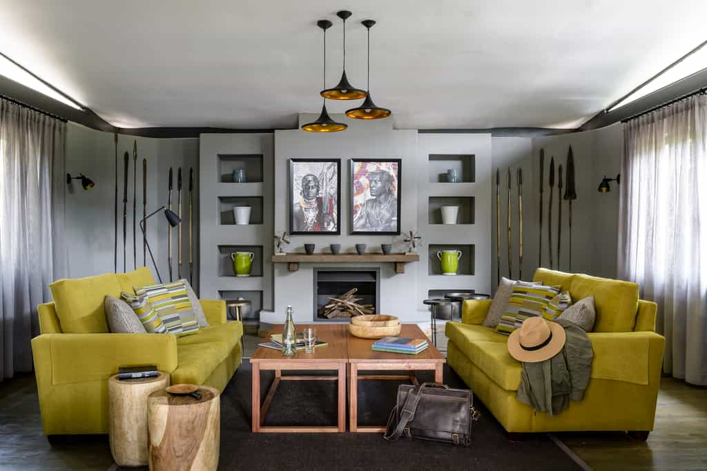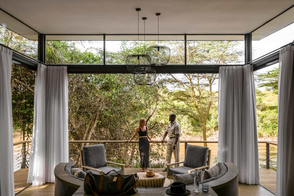 The guest area stretches along the riverbank on a raised, partially thatched timber deck where meals are served. Inside is a spacious lounge and library with a vast stone fireplace, a small curio shop, and a mini-spa. Interiors have been partly designed by the local Maasai women, using a traditional technique to “mud” the walls – an authentic African touch which mixes well with the earthy tones and fresh, contemporary furnishings. There’s a lovely swimming pool in the tropical gardens.
