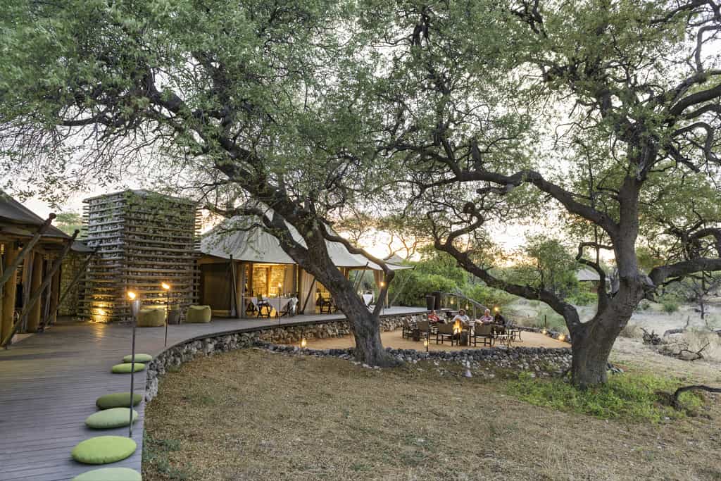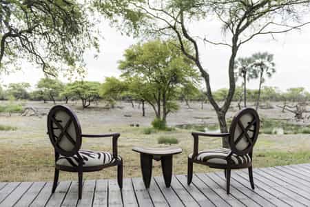 Three hand-carved giraffes guard the entrance to the open-fronted main areas. Inside are a bar, a dining room with a large table for informal dining, and lounge areas furnished with plush charcoal sofas, armchairs and large bean bags for chilling in with a cup of coffee and a book or a browse through the lodge's photo album. Outside, overlooking the waterhole, is a deck, a small pool and a fire pit encircled by directors' chairs – a perfect place to chat.