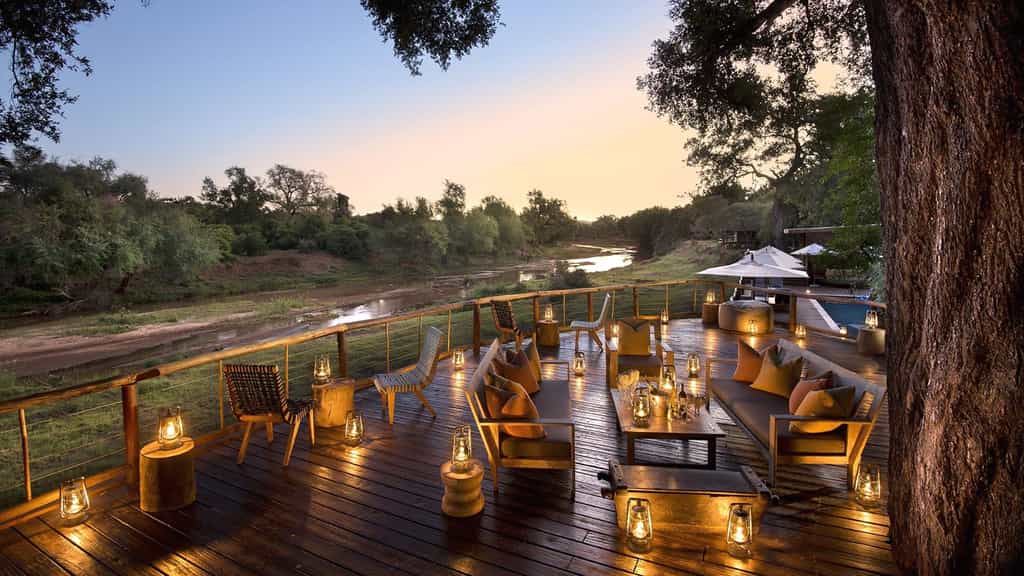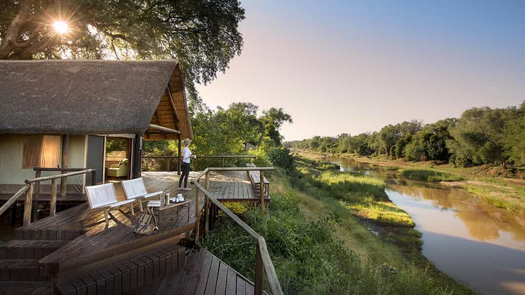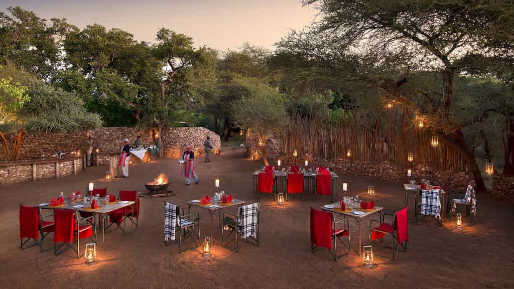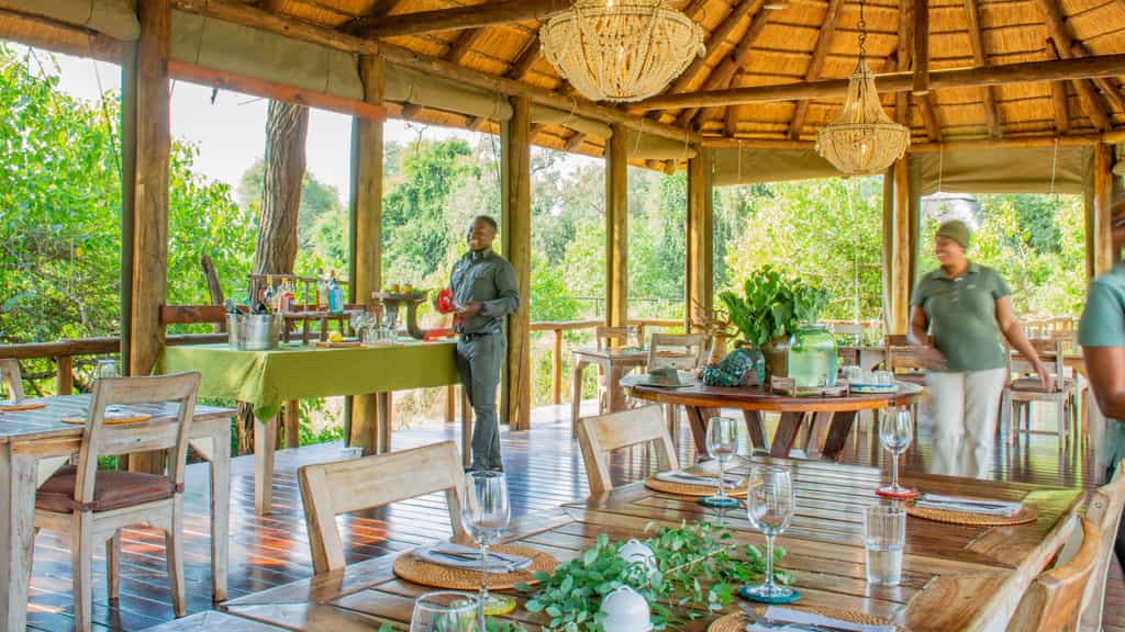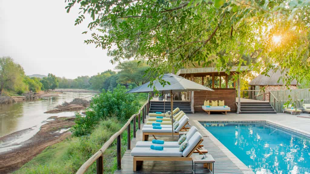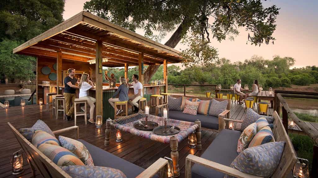 At Pafuri, classic safari meets modern quirkiness in a beautiful blend of canvas tents and thatched rooftops, pastel pillows and cushy sofas, black and white photos and vibrant art. Outside, there's a large swimming pool, surrounded by loungers, as well as trendy bucket stools that can be moved anywhere for the best view. The funky, shabeen-inspired bar looks especially enticing at night when it's aglow with lanterns and next door, the restaurant-style dining room with large booth seats is just as lovely. The best after-hours camp atmosphere, however, must be on the campfire deck that extends just above the river.