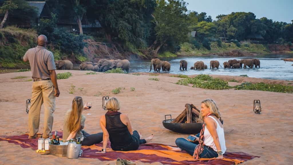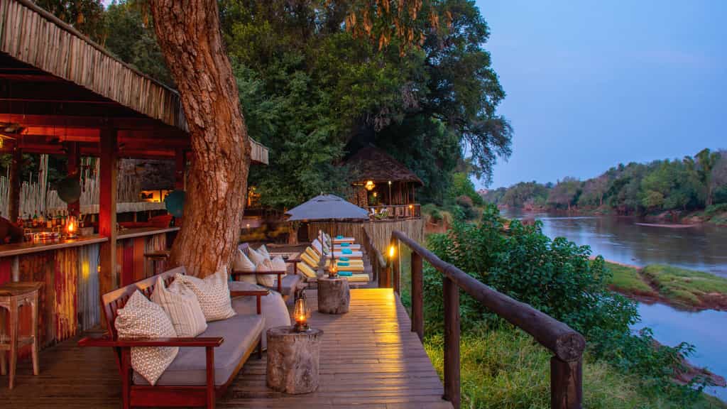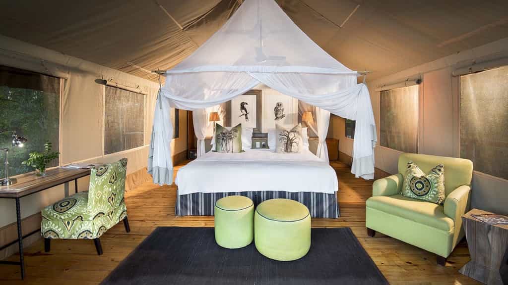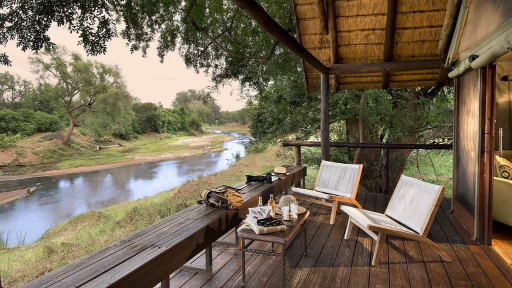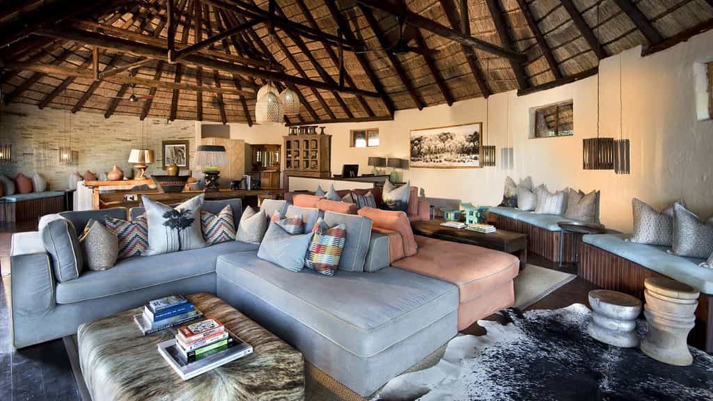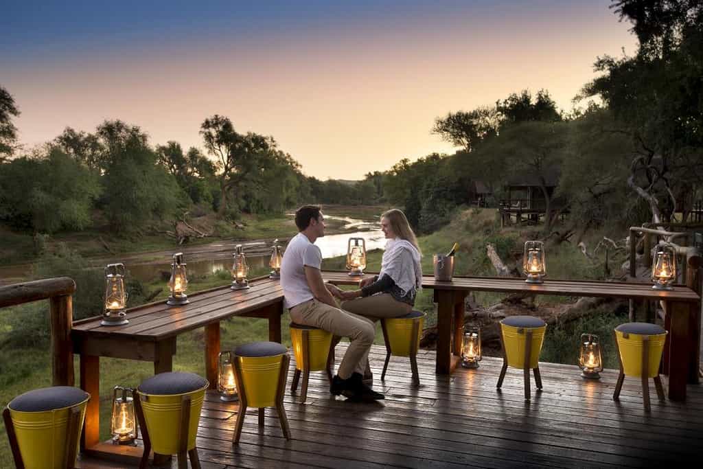 At Pafuri, classic safari meets modern quirkiness in a beautiful blend of canvas tents and thatched rooftops, pastel pillows and cushy sofas, black and white photos and vibrant art. Outside, there's a large swimming pool, surrounded by loungers, as well as trendy bucket stools that can be moved anywhere for the best view. The funky, shabeen-inspired bar looks especially enticing at night when it's aglow with lanterns and next door, the restaurant-style dining room with large booth seats is just as lovely. The best after-hours camp atmosphere, however, must be on the campfire deck that extends just above the river.
