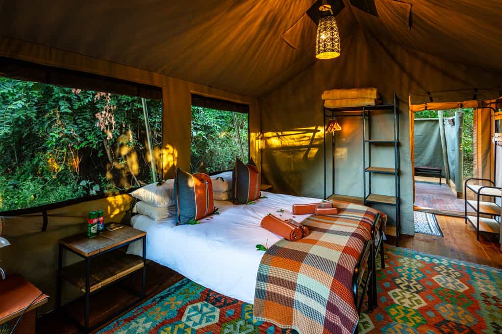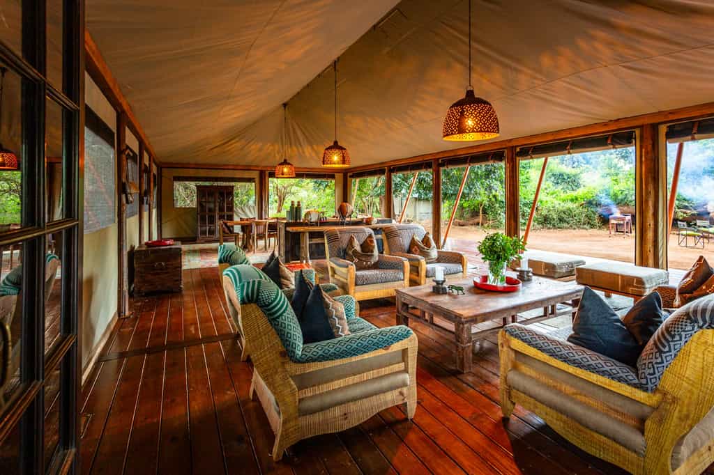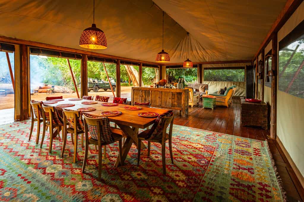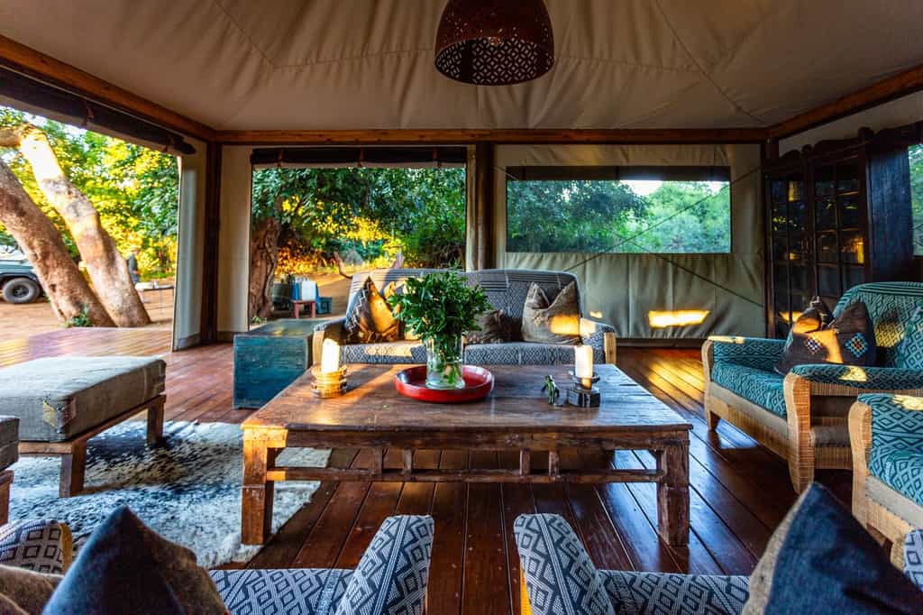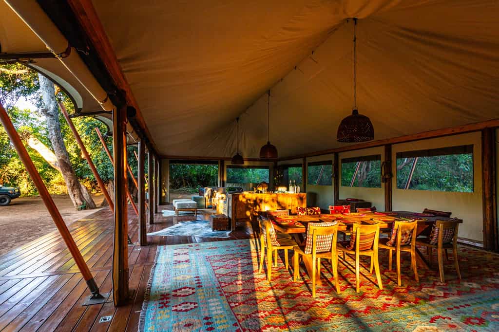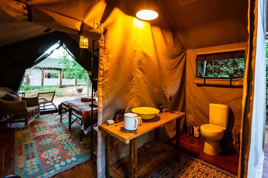 Rather like the main area, the traditional safari tents are simple yet comfortable and suit the environment down to a tee. All tents have large, mesh windows and a zip-up door, as well as ensuite bathrooms with bucket showers. At the front, a couple of camp chairs sit on the veranda. There is no electricity in the camp, so tents are lit with kerosene lanterns, their hiss and sparkle adding to the rustic atmosphere. Twin beds are soft and cosy and fluffy blankets ward off the chilly winter nights.