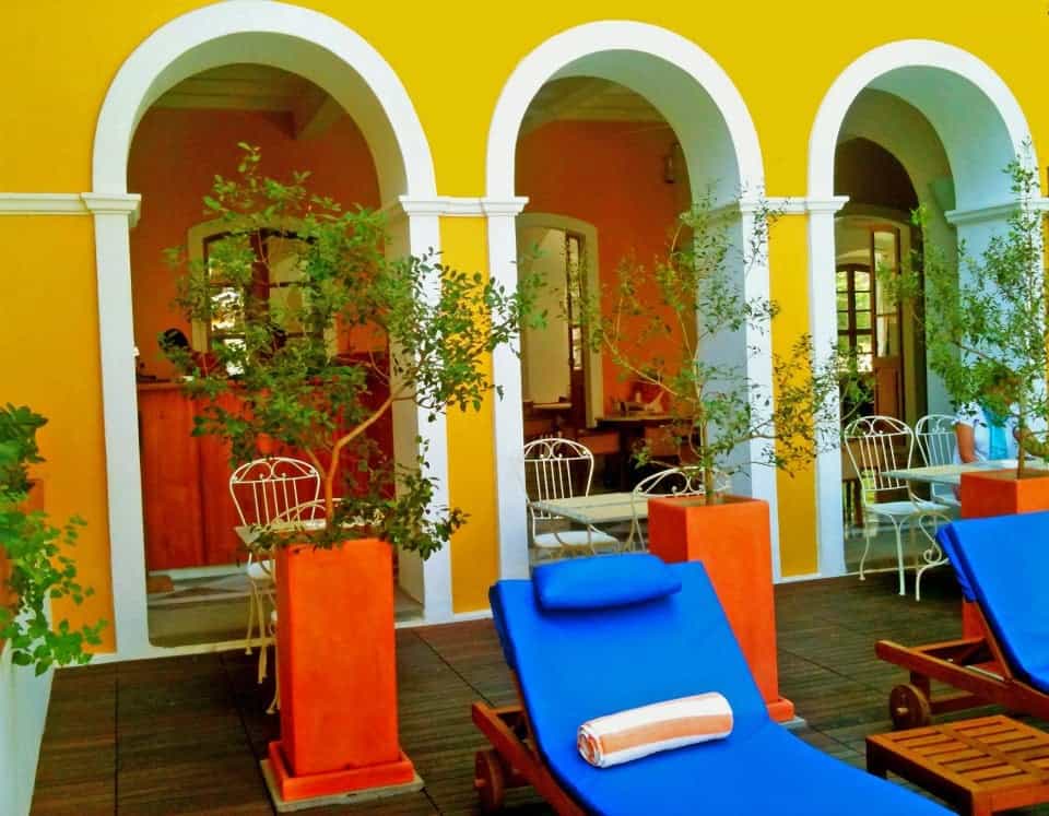 Surrounded by the sunny courtyard walls, the turquoise pool plus pinstriped loungers are very inviting. Deep verandas lined with potted plants wrap around the house and French-style arches lead from the lobby to the Earth Cafe, which opens onto the poolside patio. On the rooftop terrace, Les Alizes' serves up a variety of Indo-European cuisine including fantastic seafood. The eclectic cocktail bar is decked out in bright orange furnishings and the spa offers a range of Ayurvedic treatments.
