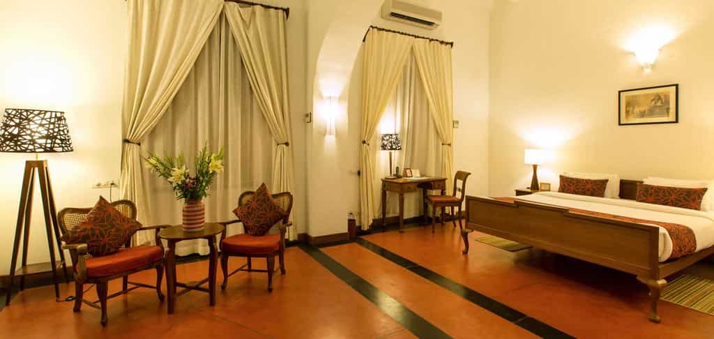 Spread over Palais' three floors, 18 Superior and Deluxe Rooms are decorated with black and white photos of Pondicherry and vintage furnishings. Each room has a king size bed, sitting area on the veranda and en-suite bathroom with toiletries in terracotta pots. Uncluttered and spacious, the rooms also come with a desk, TV, tea/coffee facilities and a wardrobe. The Deluxe Rooms have a lounge area and some also come with a private terrace overlooking the courtyard.