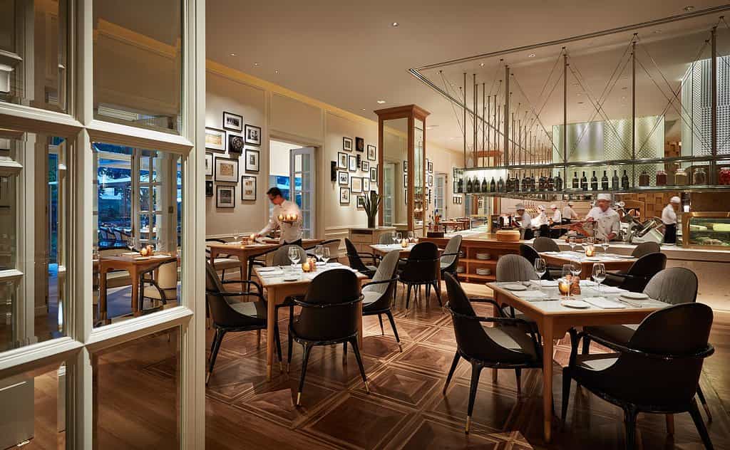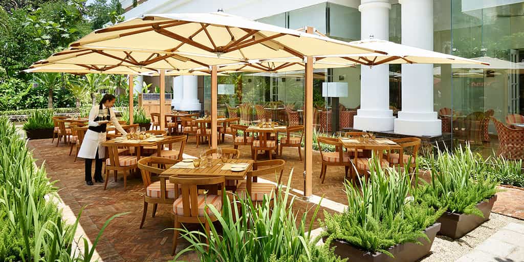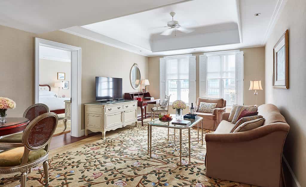 Like snapshots of a French boudoir, the rooms and suites are coloured in soft creams, embroidered rugs and ornate moulded furnishings. White shuttered windows let in plenty of light, while some rooms also have a cosy balcony. Ivory-tiled bathrooms have wooden vanities, rain showers and Cochine lotions. The suites all have a living room with blush couches and a large TV unit. Decorated with rich oil paintings, the grandest offering is the Presidential Suite, which comes with a private study, walk-in closet, dining room and kitchen.