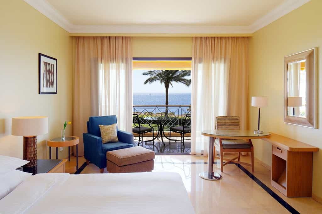 Favouring the natural beauty outside, the rooms are simply but tastefully done. The colour palette is in neutral, sandy tones, the King-sized beds are topped with soft Egyptian cotton, and the large bathrooms are perfect for pampering, featuring walk-in showers and Dead Sea mineral toiletries. Each room has a balcony with scenic views of the Red Sea, but the sizes vary with the largest being the double-storey Royal Villa, which has an indoor and alfresco dining area, full kitchen and resident chef, and a sunken Jacuzzi.