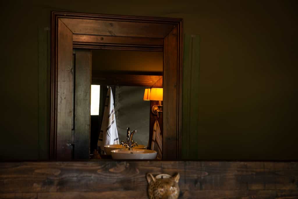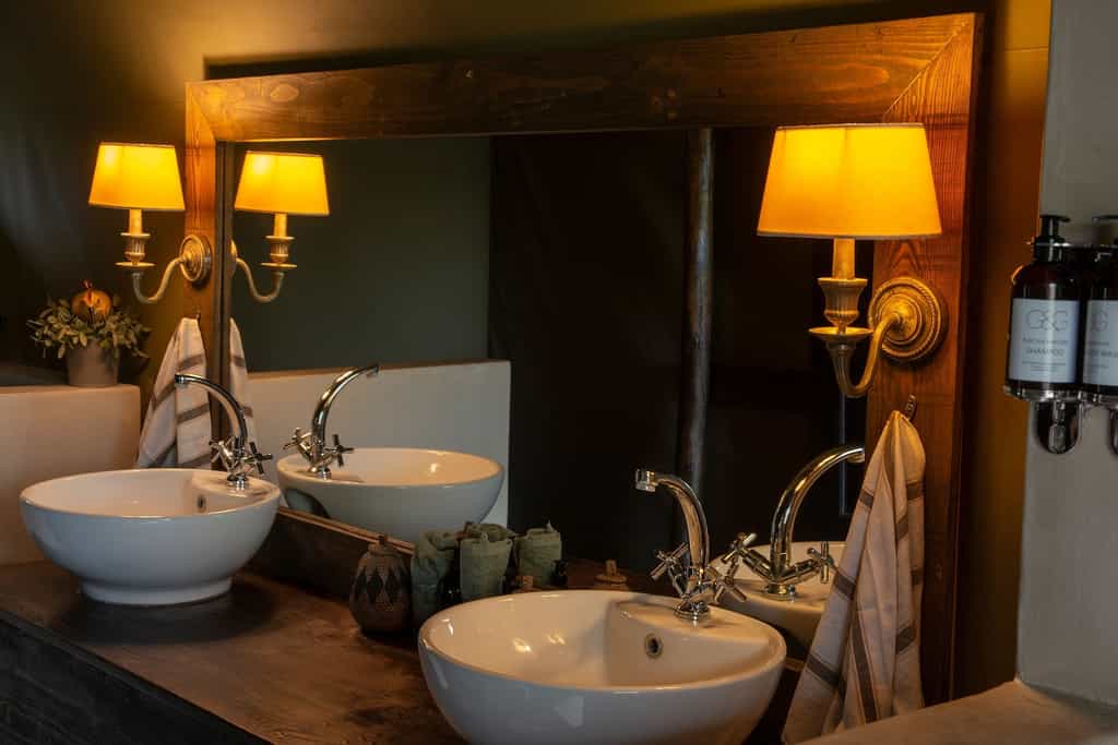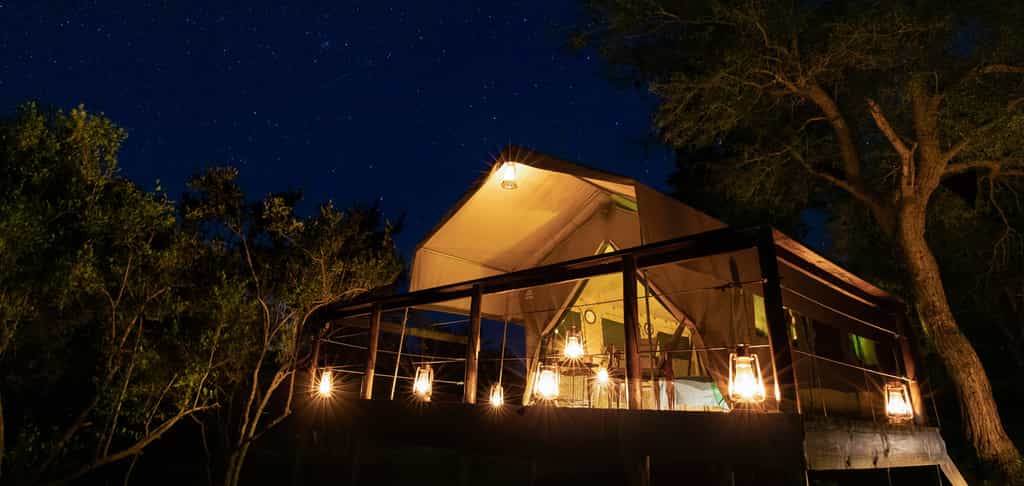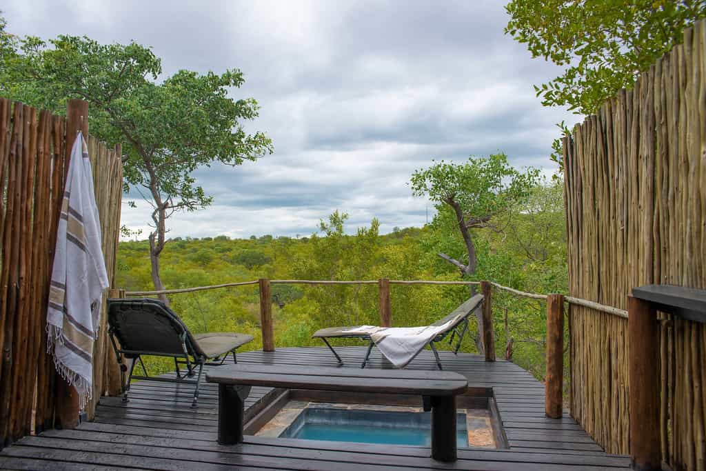 The luxury safari tents both have a private viewing deck. One tent has a view of the lit-by-night waterhole. The other tent has a stunning view over the bushveld. The tents offer a king size extra length bed or two twin beds, with 300 thread percale linen, fine décor, an ensuite bathroom with toilet, indoor or outdoor shower, jacuzzi, egyptian cotton towels and high quality amenities. You have a ceiling fan, and a safe in your tent. Mosquito nets are available.