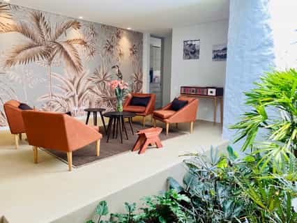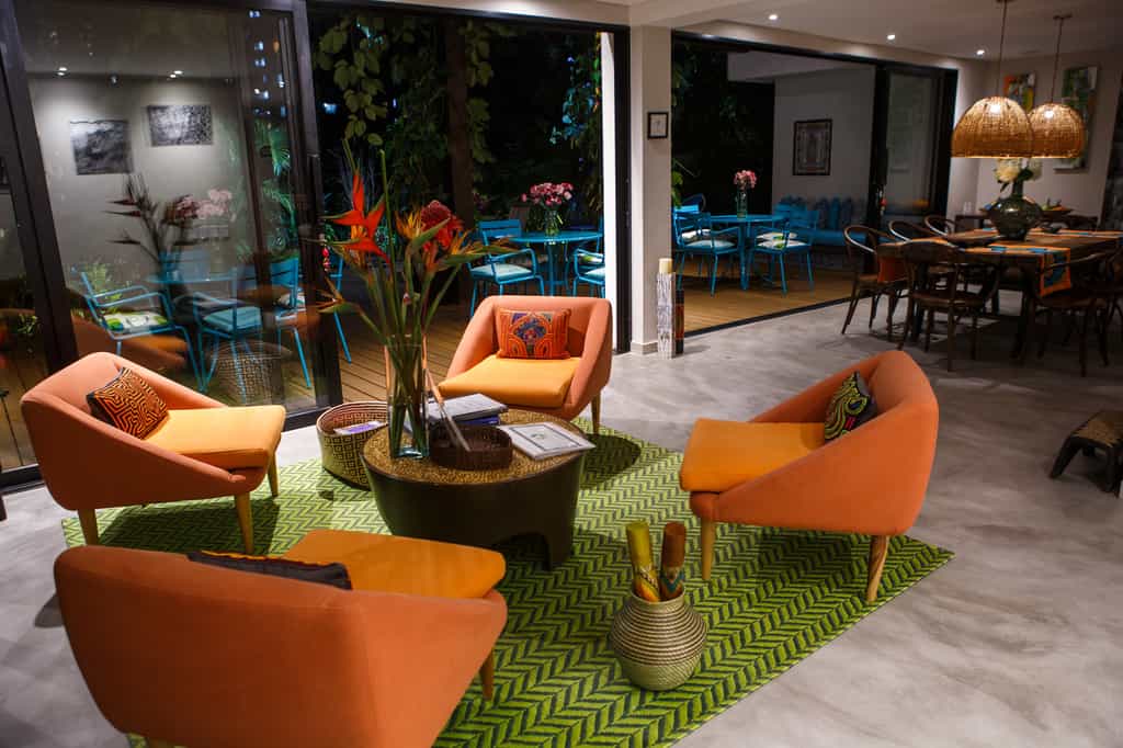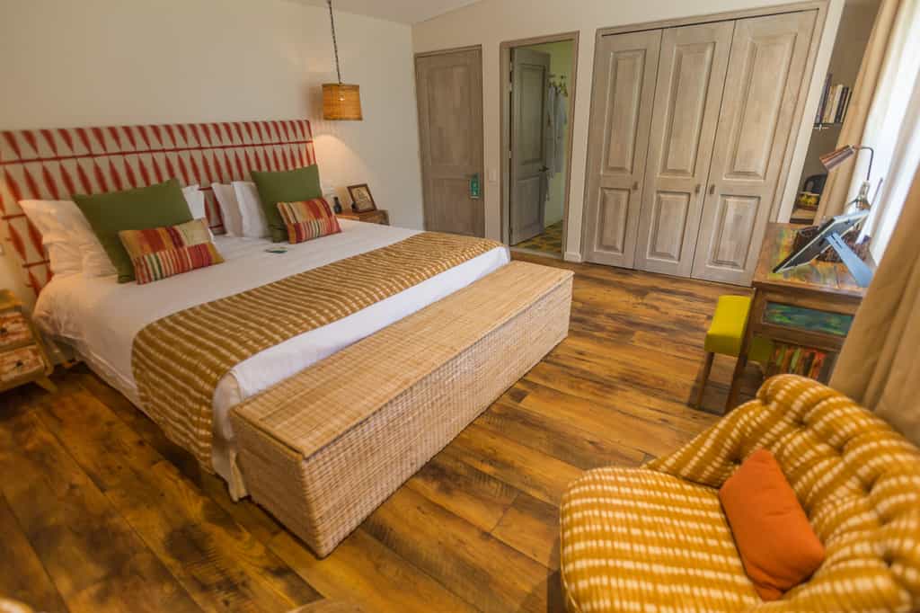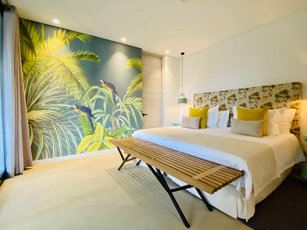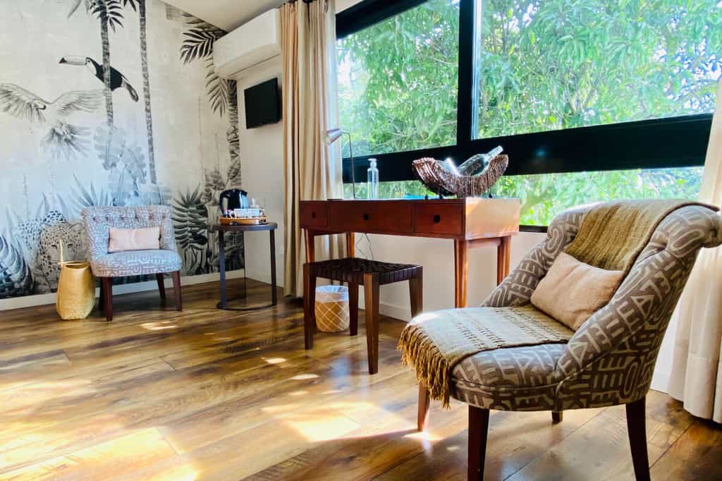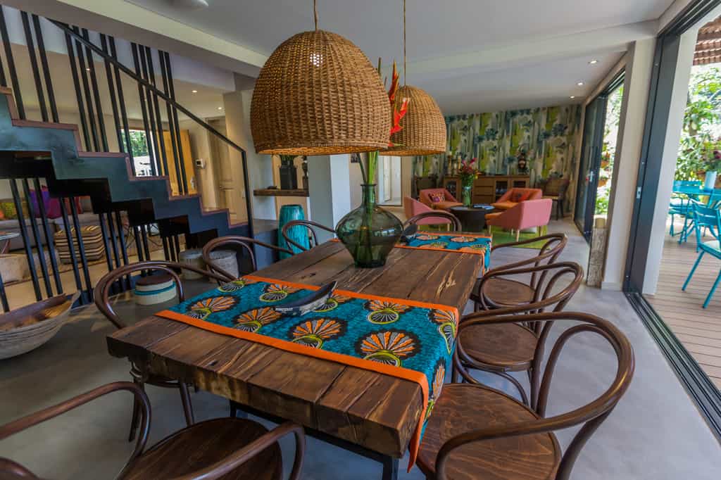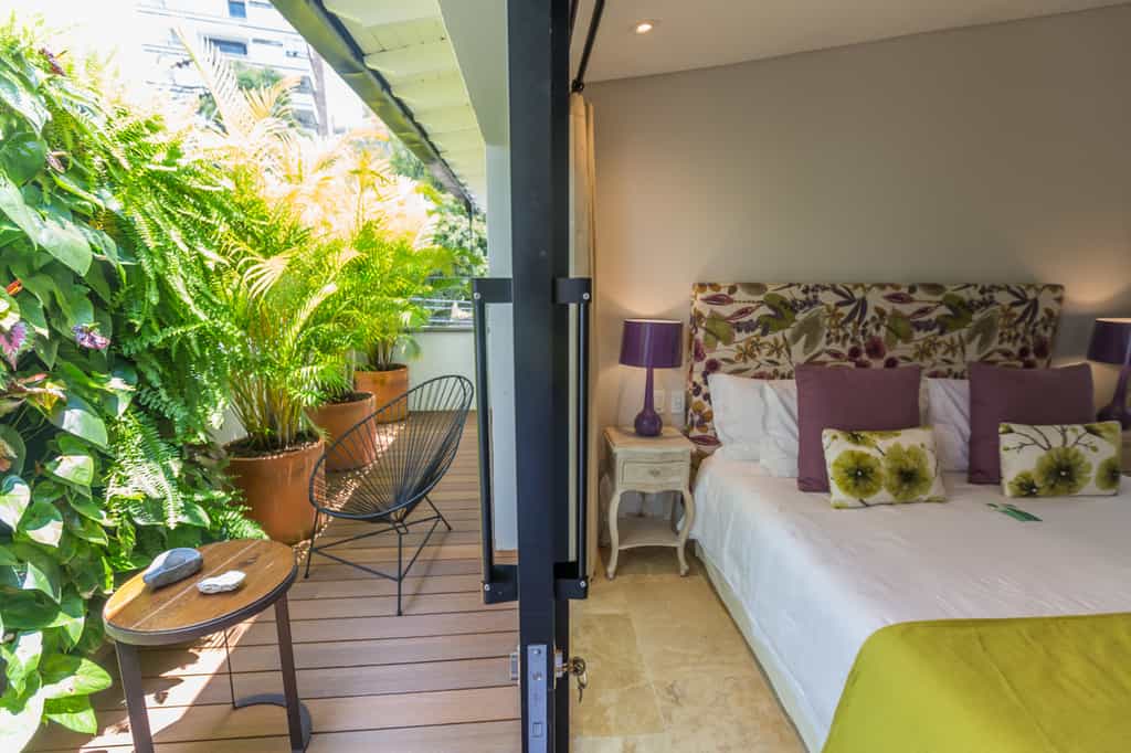 There are 13 rooms, each named after a place visited and loved by the owners, and decorated accordingly. The Provence room is accented with shades of lavender, whilst the India rooms are draped in vivid textiles. Features vary from room to room but can include private hot tubs, terraces strung with hammocks, and large bathrooms. Overall, the rooms are light-filled and artfully done with bold design choices accented by chic, minimalist furnishings.