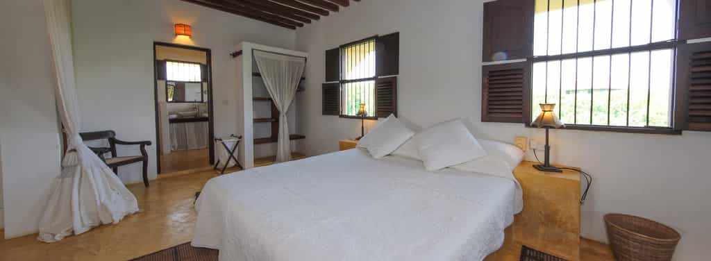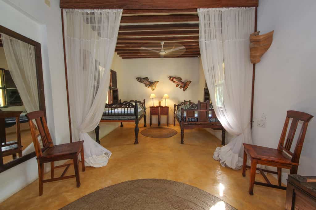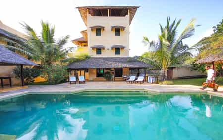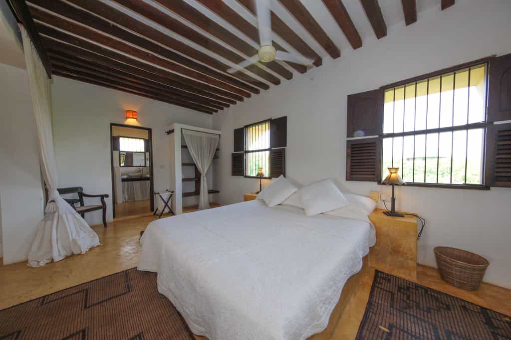 The house, which sleeps up to 10 guests, rises up out of the central part of the property. On the ground floor is a twin bedroom; the first floor offers two double en-suite bedrooms; and the second floor houses the huge master suite, its private terrace overlooking the sea. Outside, a separate guesthouse has an en-suite guestroom, a pool and massage room. All the rooms are spacious, decorated with local Swahili flair and a touch of glam, and mosquito nets.