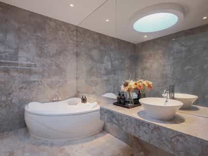 The villas are all set in private patches of garden with their own pools and sundecks. Interiors are fresh and airy and you can expect King-sized beds draped in netting and indoor-outdoor marble bathrooms with exceedingly gorgeous sunken baths. All have a fully-equipped kitchen with open-plan living and dining areas dotted with white-cushioned furnishings. Glass doors open to reveal the pool. Villas range from one to five bedrooms and the largest can accommodate up to 10 adults and four children.