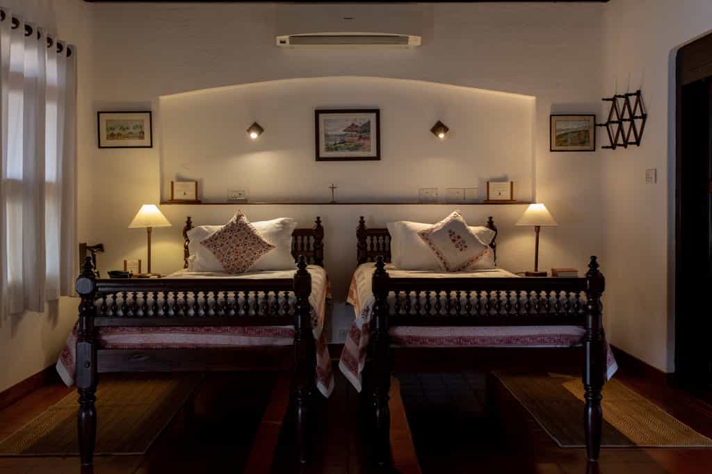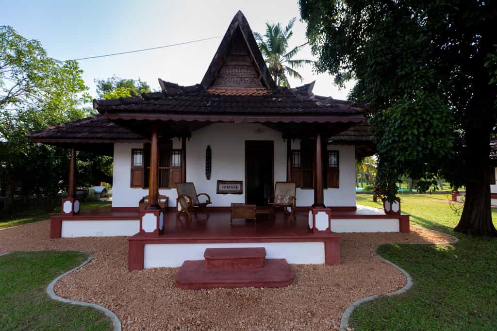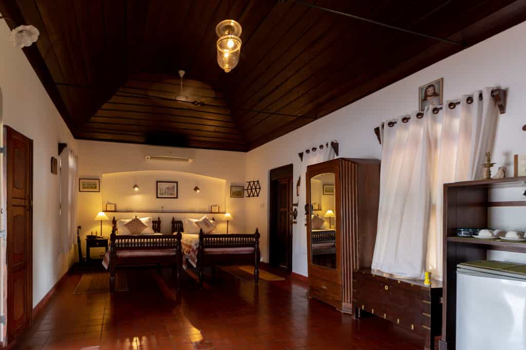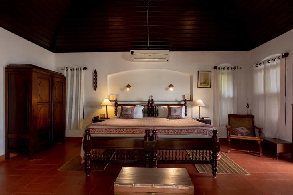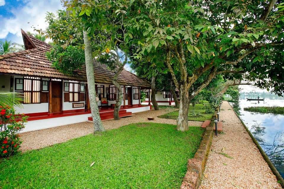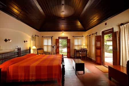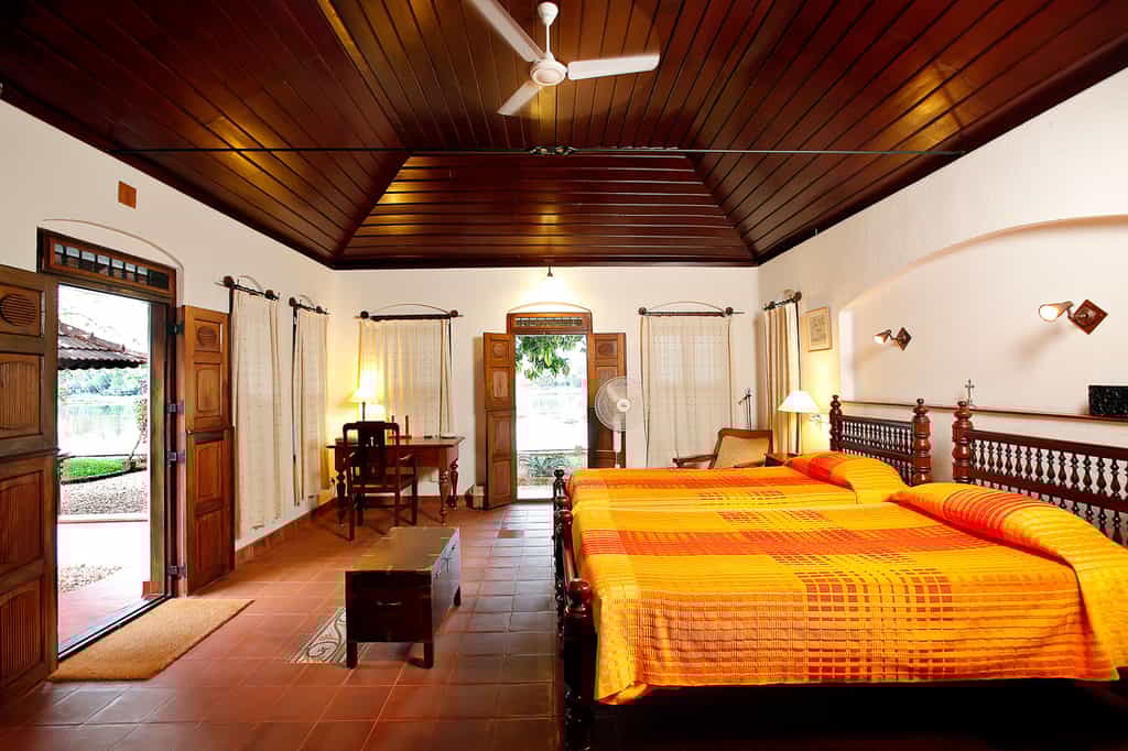 Phillipkutty's villas are built in a traditional style but with a separate bedroom, living area and wrap-around veranda in red oxide. Each villa has a view over the lake and are aptly named after the local flora and fauna. Decorated in dark wooden furnishings, crafted doors and shades of yellow and orange, the villas have a homely feel. Their amenities include a desk, air con, wardrobe, tea/coffee facilities and netted windows. Although there's no TV, you can make use of the one in the main house.