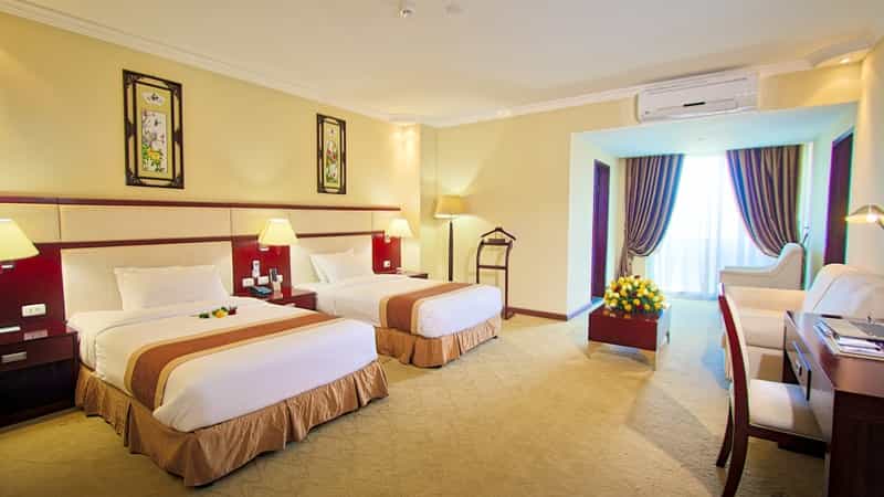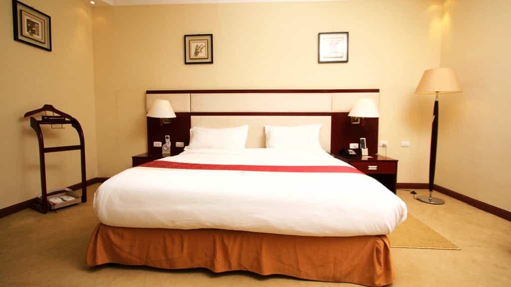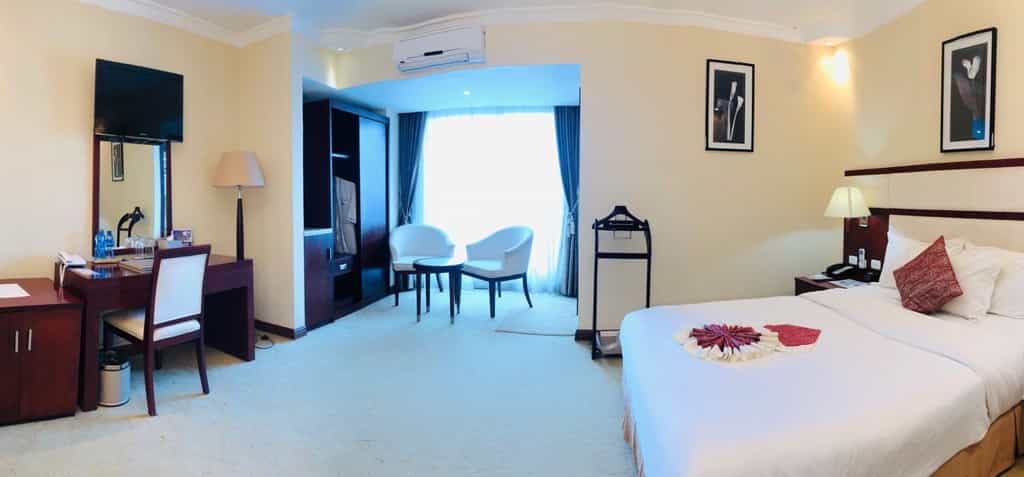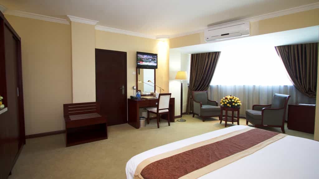 Rooms here range from the Standard, which sleeps two guests in either a double or two twin beds, and has a footprint of 28 square metres, to the Executive Suite, which sleeps four guests in a king and two twin beds and spreads across a roomy 98 square metres. In between are Queen and the Suite – offering a king-sized bed. All rooms have wi-fi (if intermittently), minibars, aircon and en-suite bathrooms.