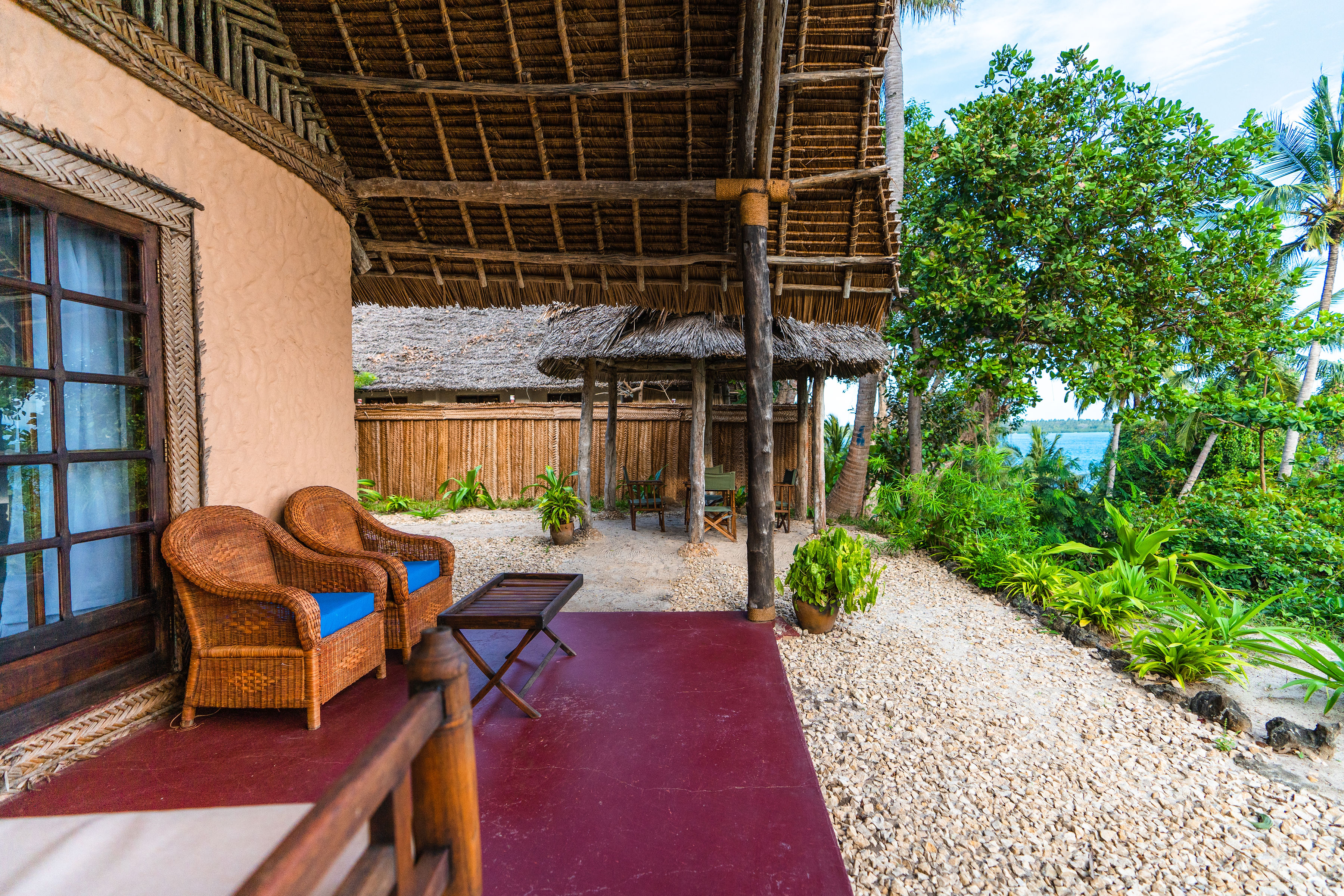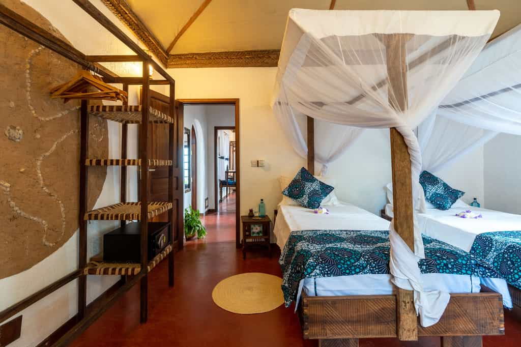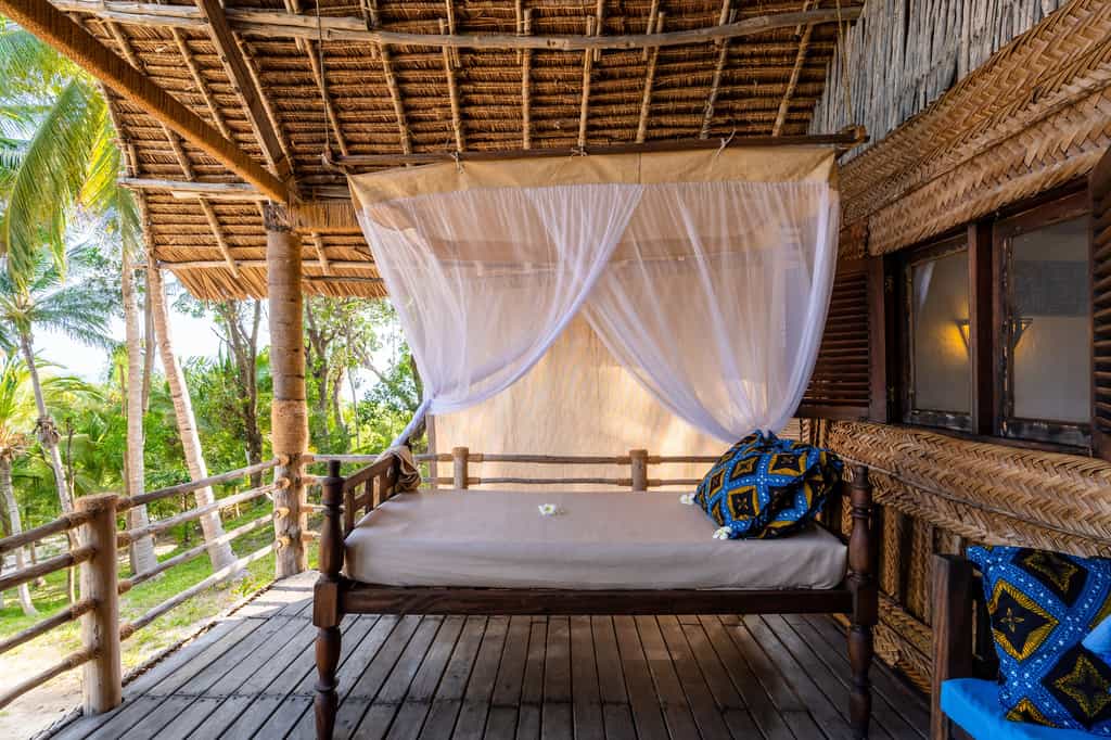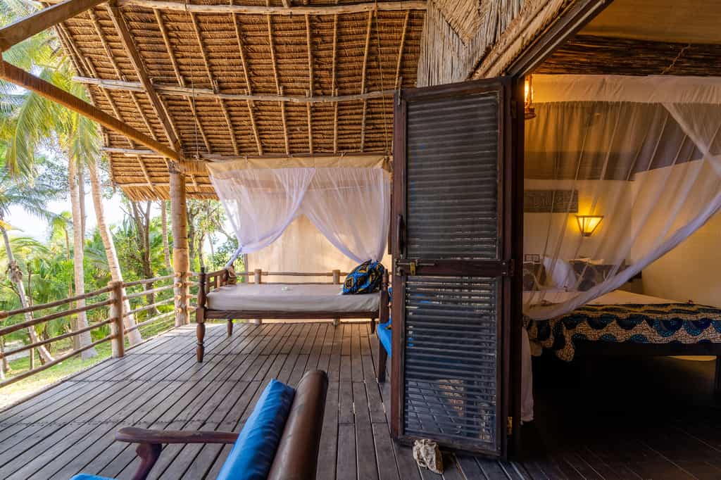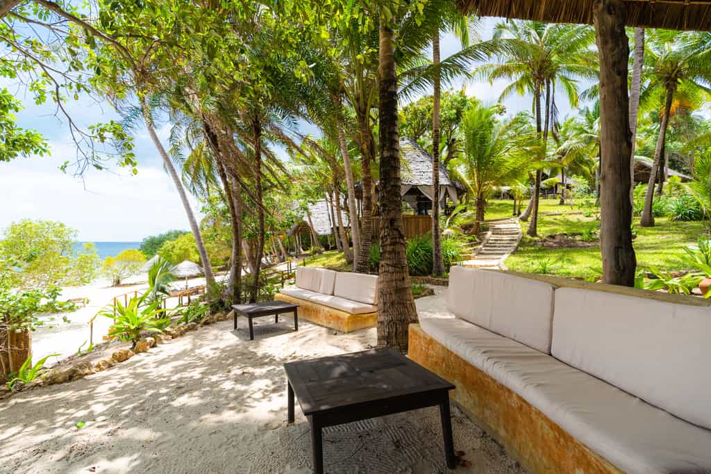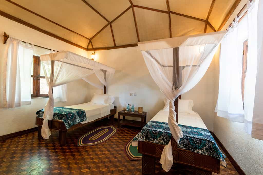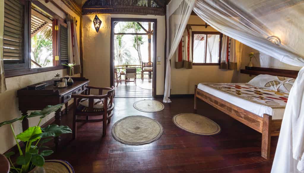 Each of the five large self contained bungalows and two family styled bungalows are nestled amongst the palms. While there might not be expansive views over the water the privacy on offer is a draw card. Makuti thatched roofs furnished with traditional Tanzanian wooden furniture such as large poster beds, outdoor day beds and delicate decorative elements scattered throughout. In keeping with eco principles there is only natural ventilation that cools you down satisfactorily.
