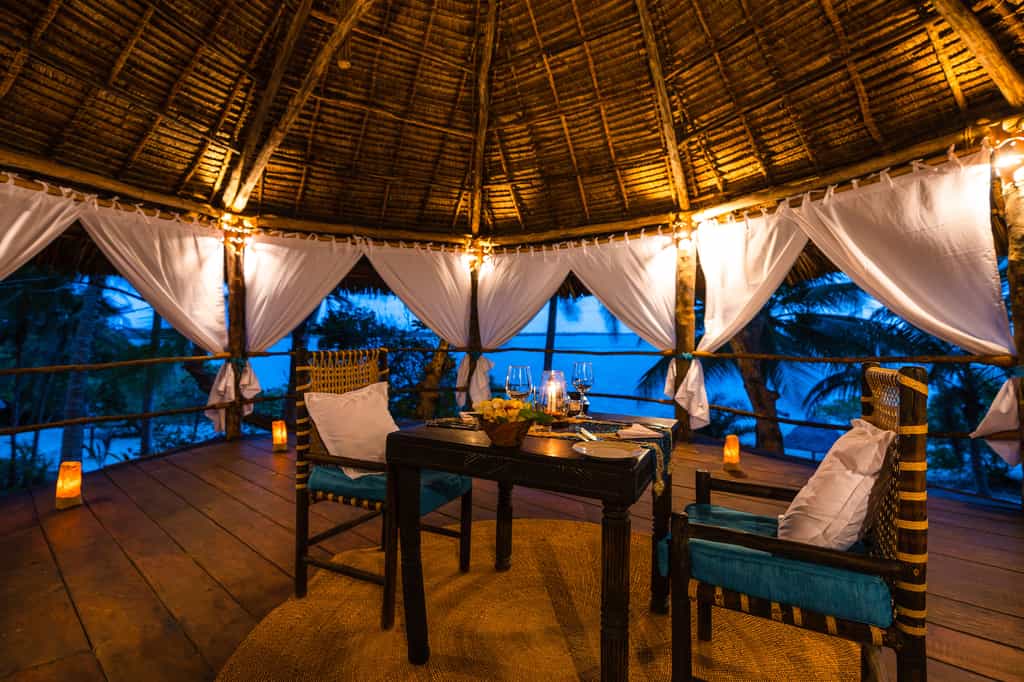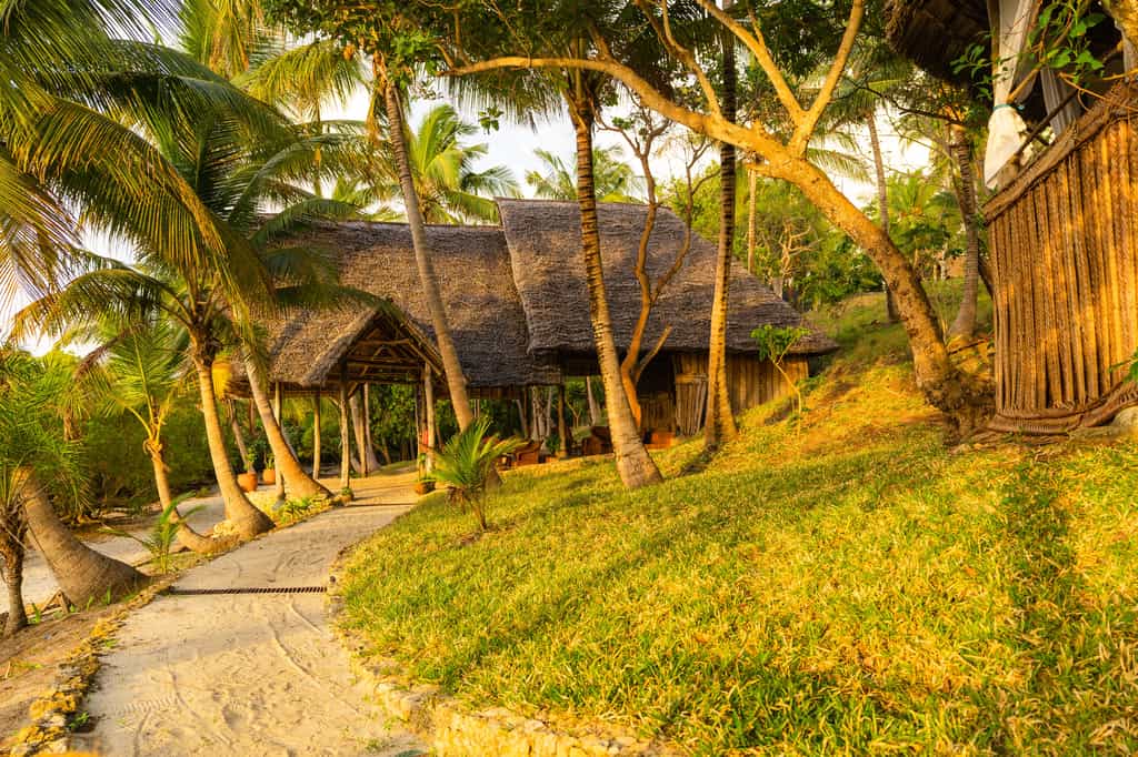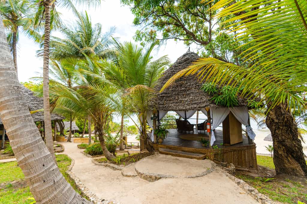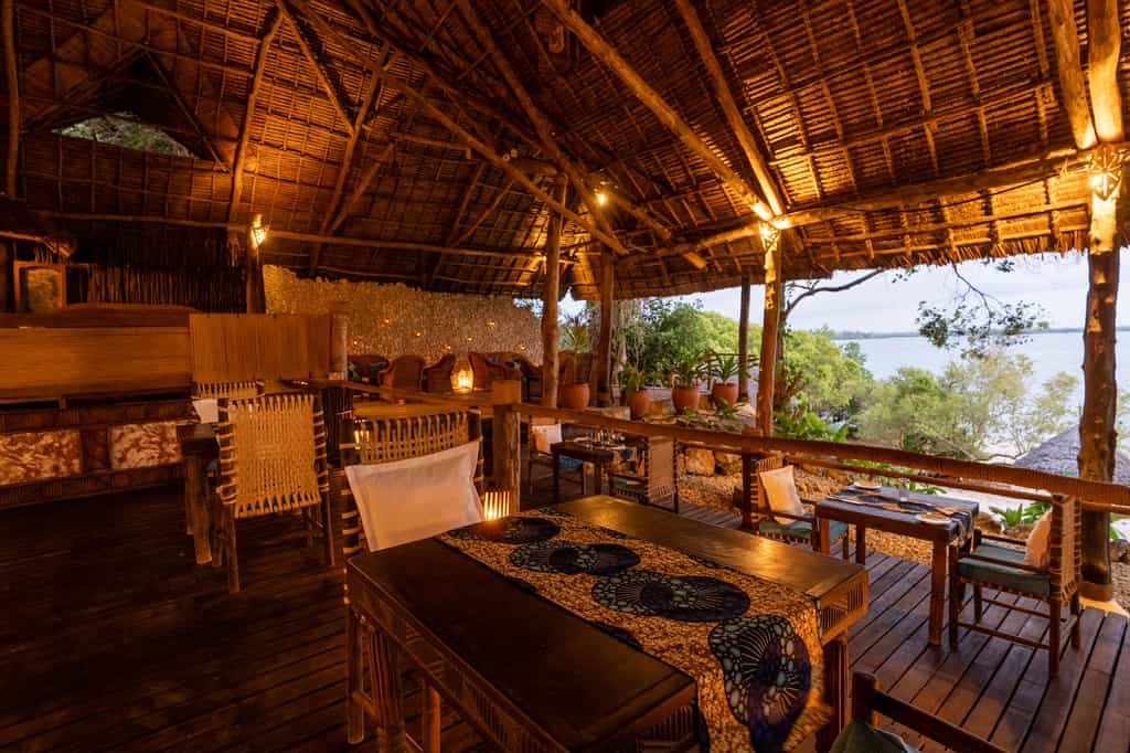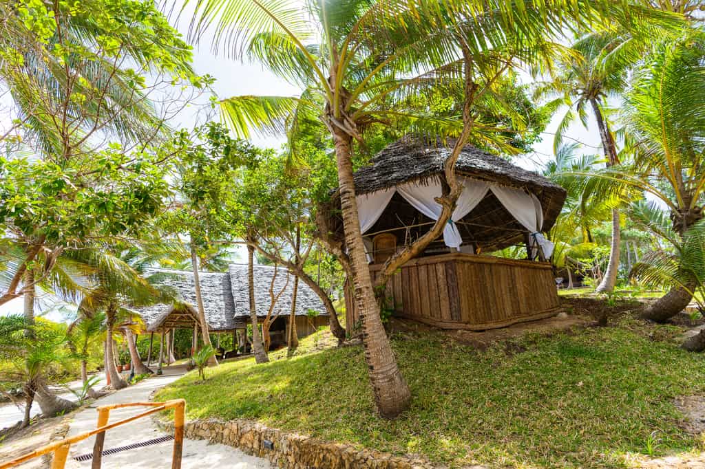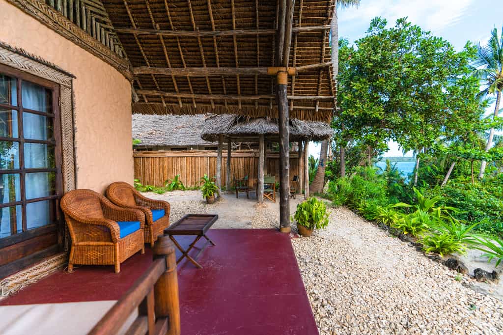 Each of the five large self contained bungalows and two family styled bungalows are nestled amongst the palms. While there might not be expansive views over the water the privacy on offer is a draw card. Makuti thatched roofs furnished with traditional Tanzanian wooden furniture such as large poster beds, outdoor day beds and delicate decorative elements scattered throughout. In keeping with eco principles there is only natural ventilation that cools you down satisfactorily.