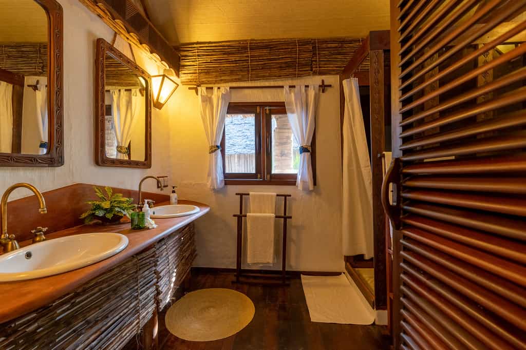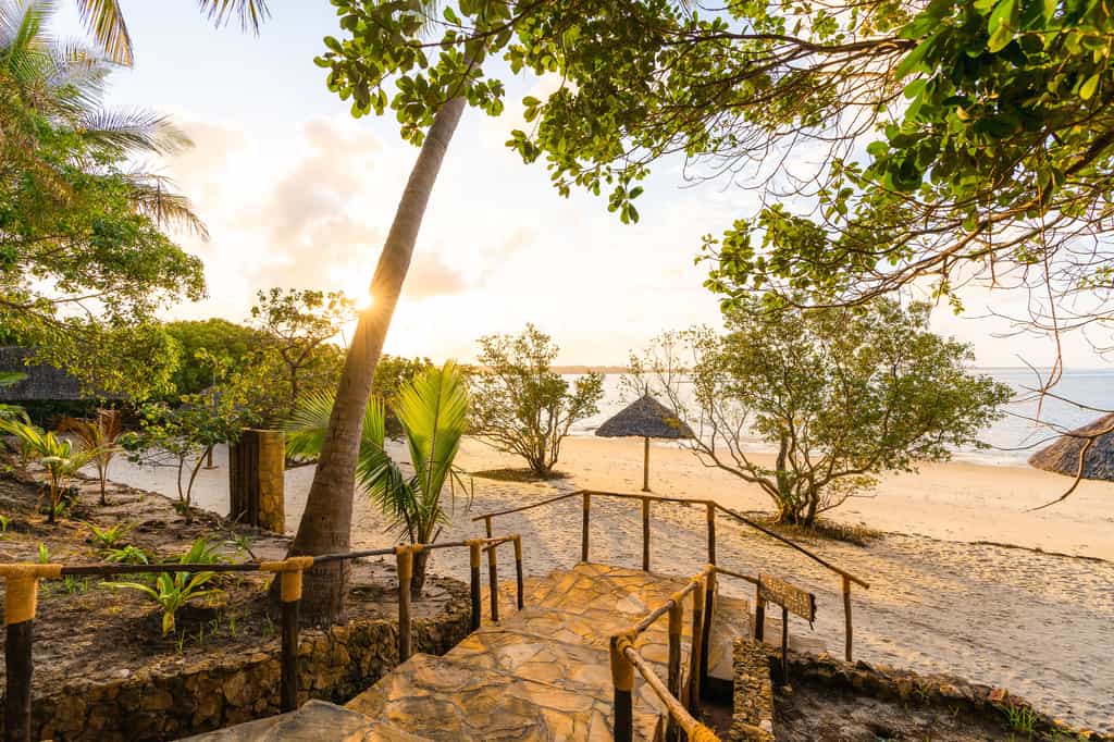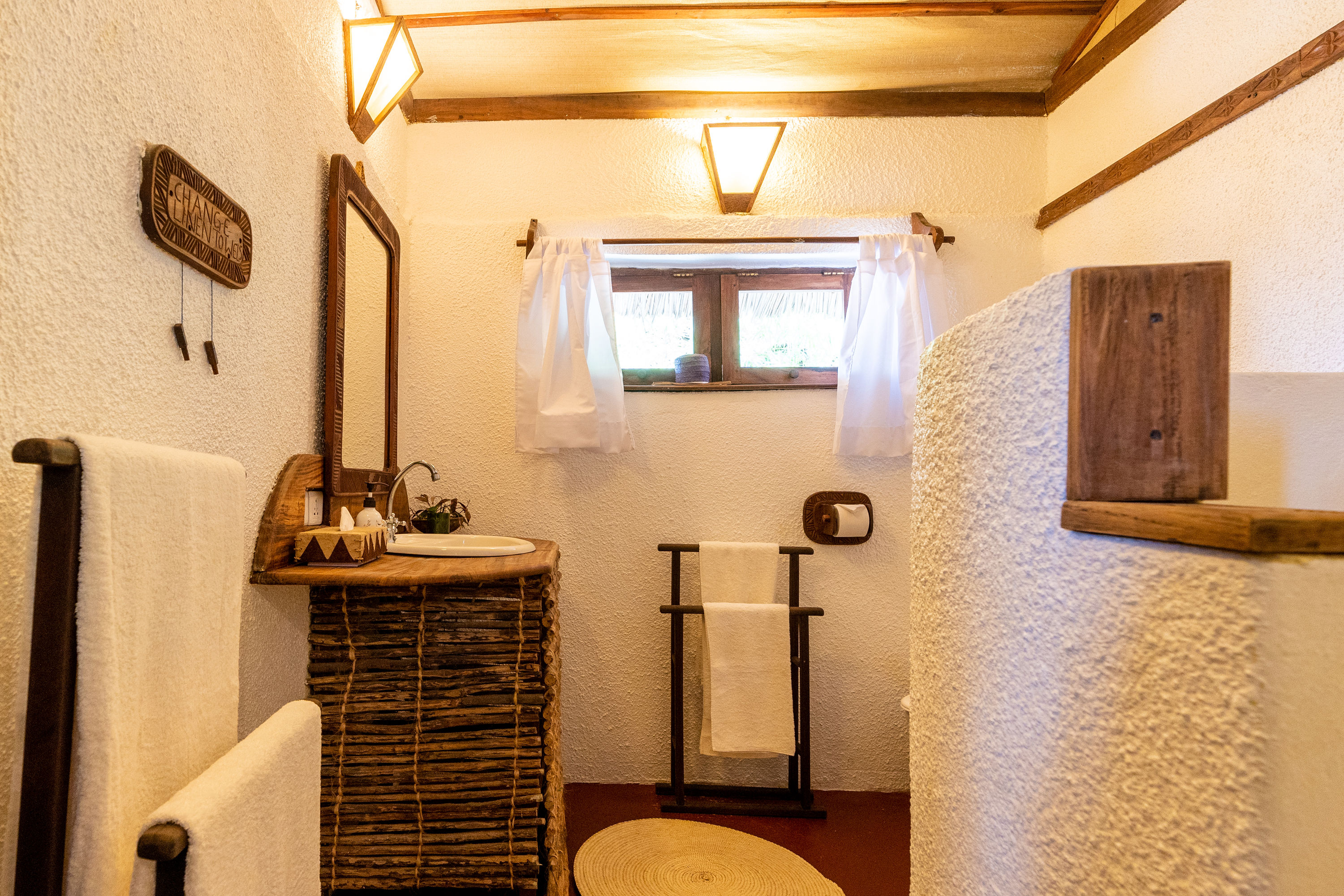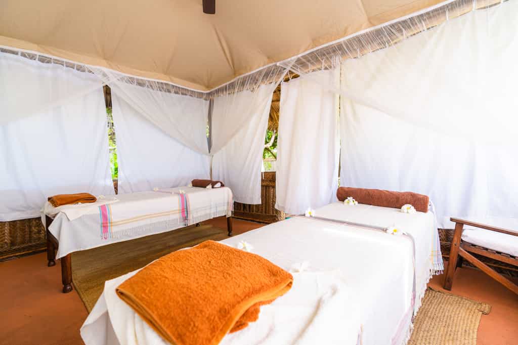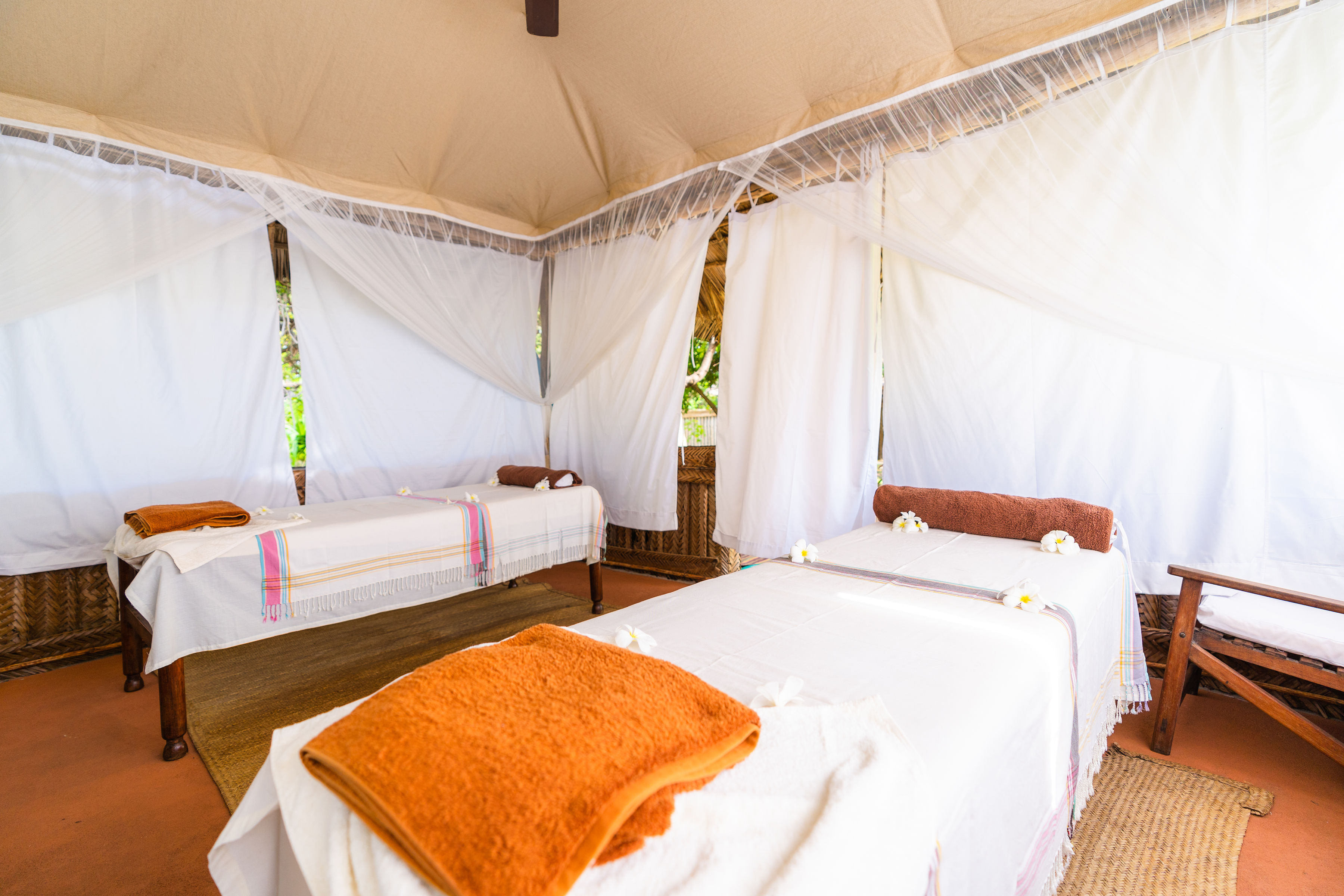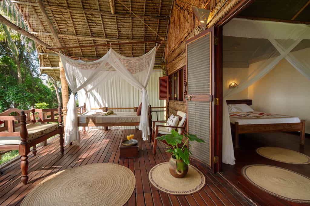 Each of the five large self contained bungalows and two family styled bungalows are nestled amongst the palms. While there might not be expansive views over the water the privacy on offer is a draw card. Makuti thatched roofs furnished with traditional Tanzanian wooden furniture such as large poster beds, outdoor day beds and delicate decorative elements scattered throughout. In keeping with eco principles there is only natural ventilation that cools you down satisfactorily.
