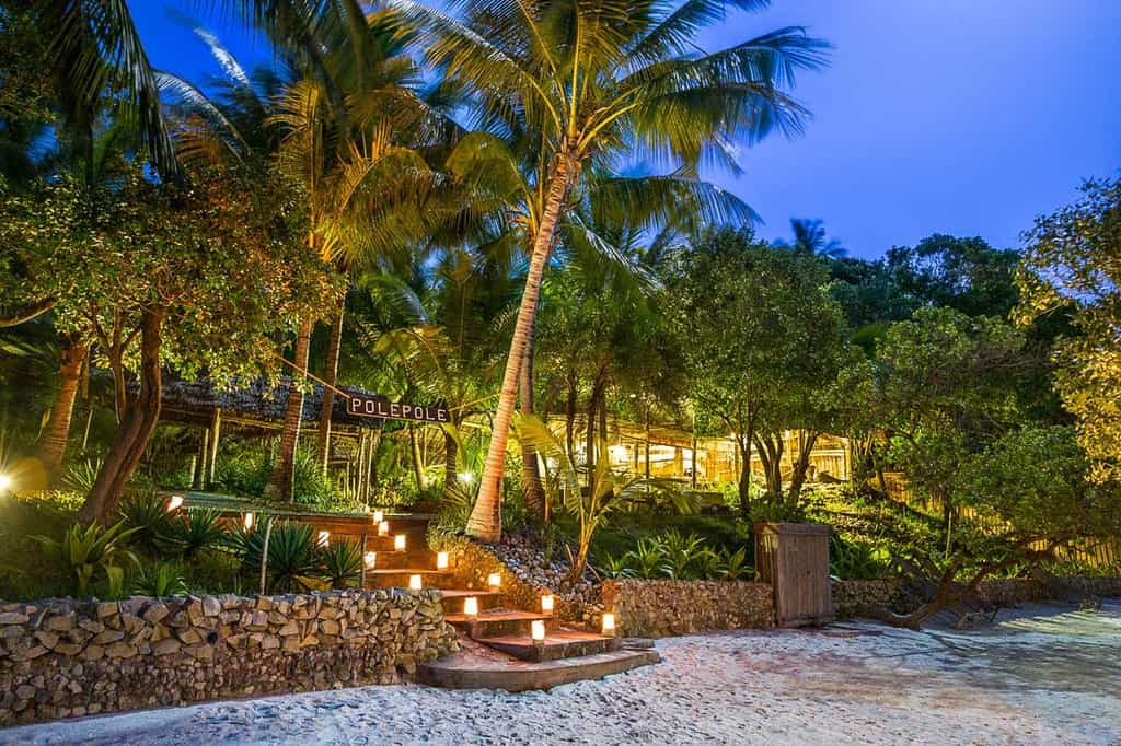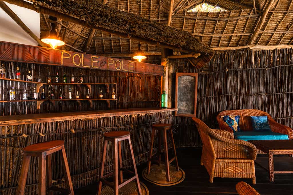 Pole Pole is not showy, but rather refreshingly elegant. Simple Makuti structures are built from local materials. The reception area leads down to and a raised wooden dining platform near the water, all with open sides to maximise the breeze coming off the water and pathways lead off into the bush to each of the bungalows. A little bar,where only the sounds of the palms trees can be heard, is the perfect sundown spot.