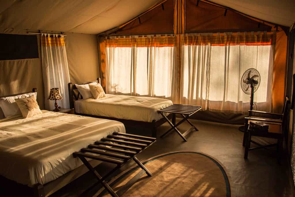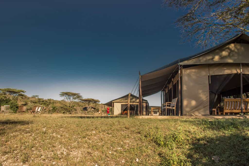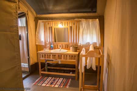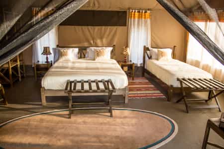 Set at the base of a rocky outcrop, six large canvas tents are shaded by a few tall acacia trees. The tents are simple in design, with few bells and whistles, but they're more than comfortable with large double beds, plenty of storage space and a few beautifully woven rugs adding a touch of elegance. One room can be made up to sleep three. The en-suite bathrooms have basins, a shower and a separate toilet. The entire camp is solar-powered.