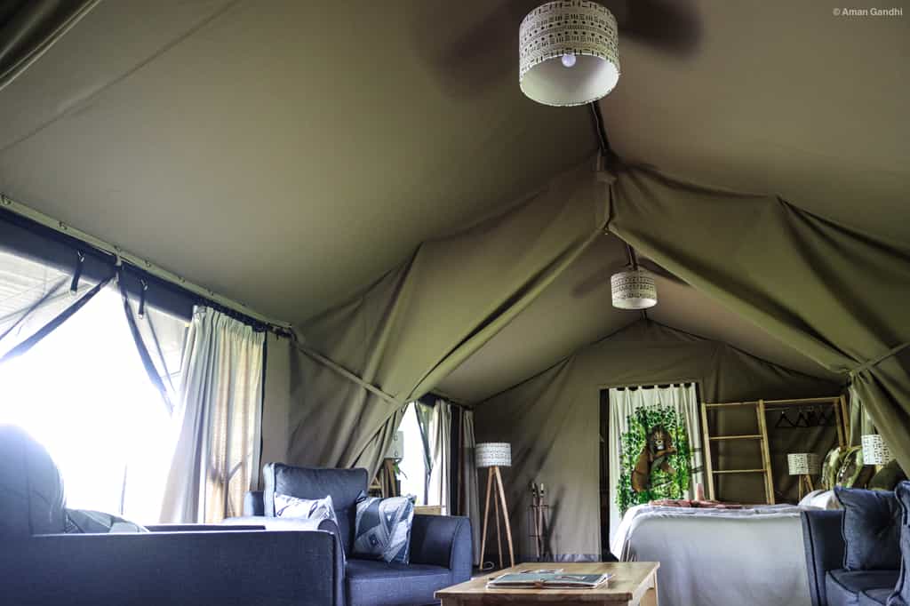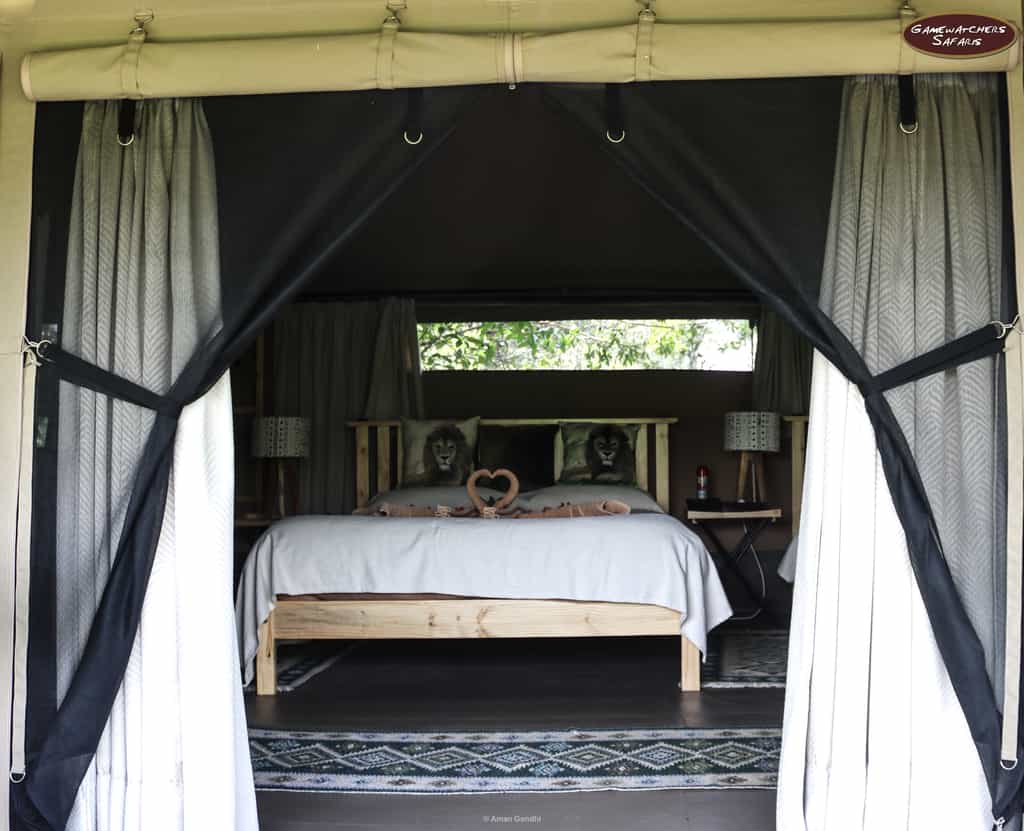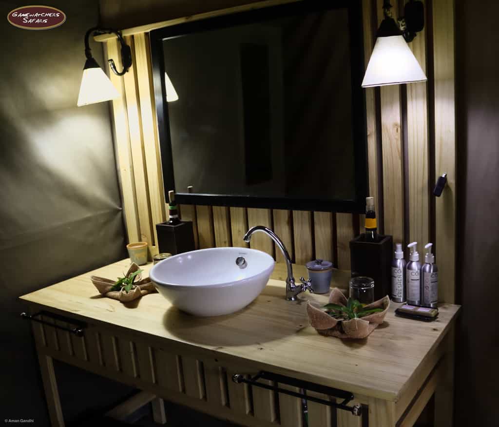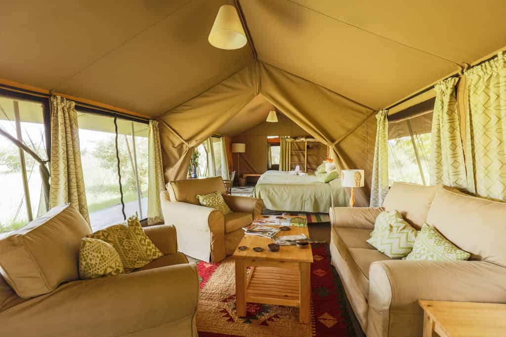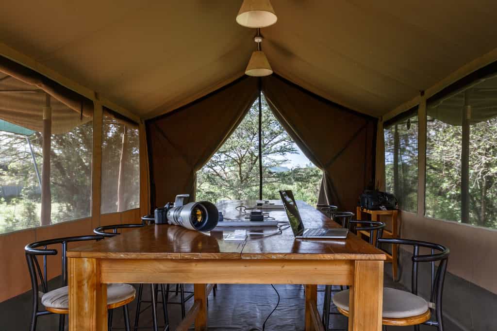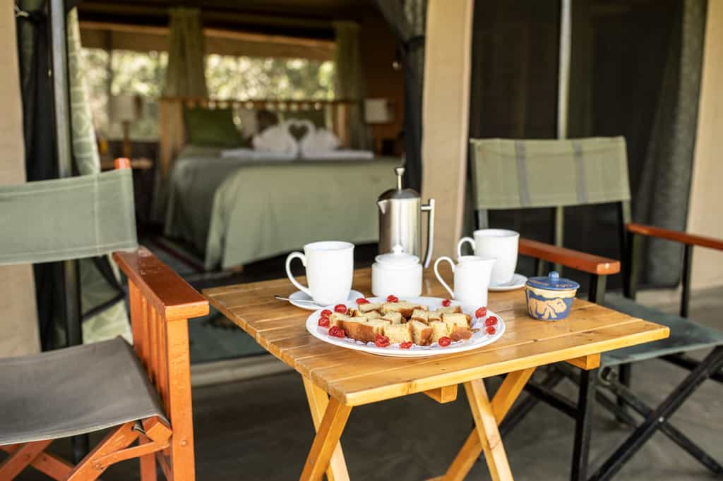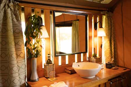The guest area at the centre of the camp is a huge canvas tent with roll-up mesh sides sheltering the comfortable lounge and open-plan dining area. The feel is one of functional simplicity, with modern styles in neutral tones, inviting armchairs and cosy rugs, and sturdy dining tables and chairs. A well stocked bar, and tea and coffee-making facilities are available throughout the day – a great spot to enjoy a drink and watch the river flowing past.