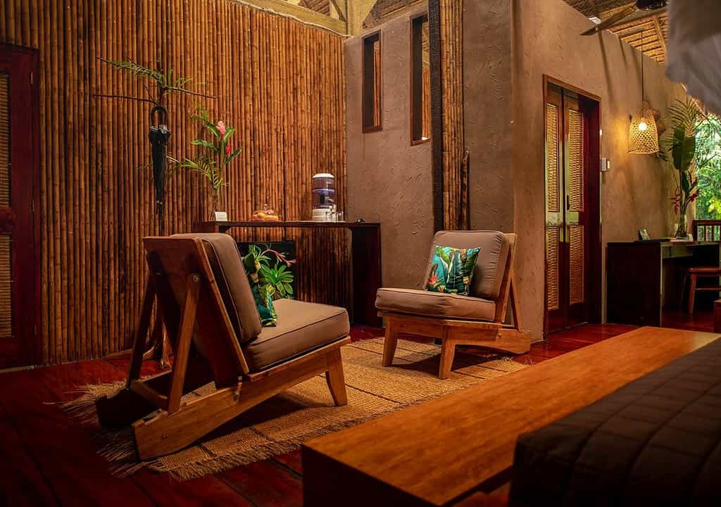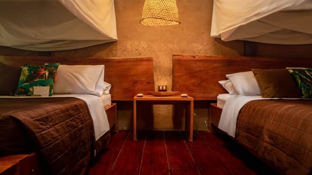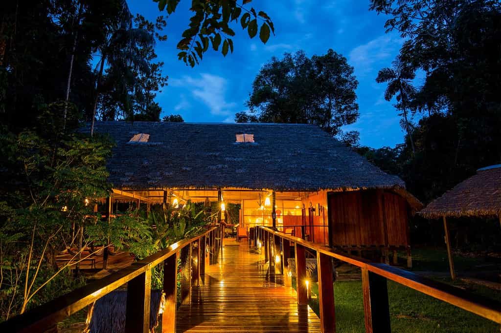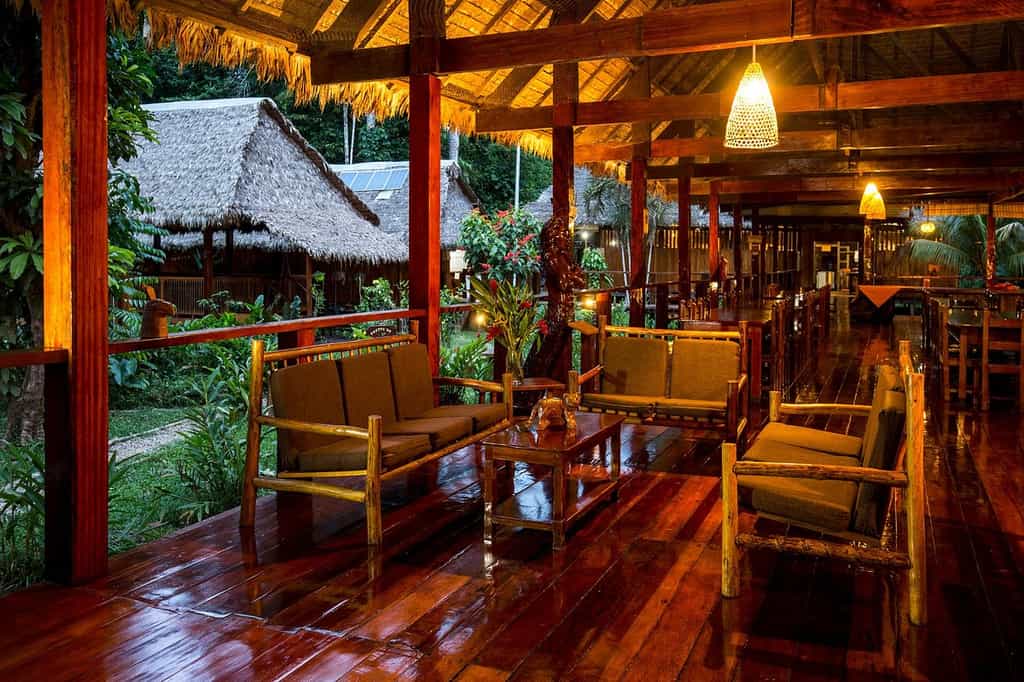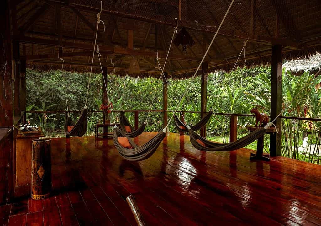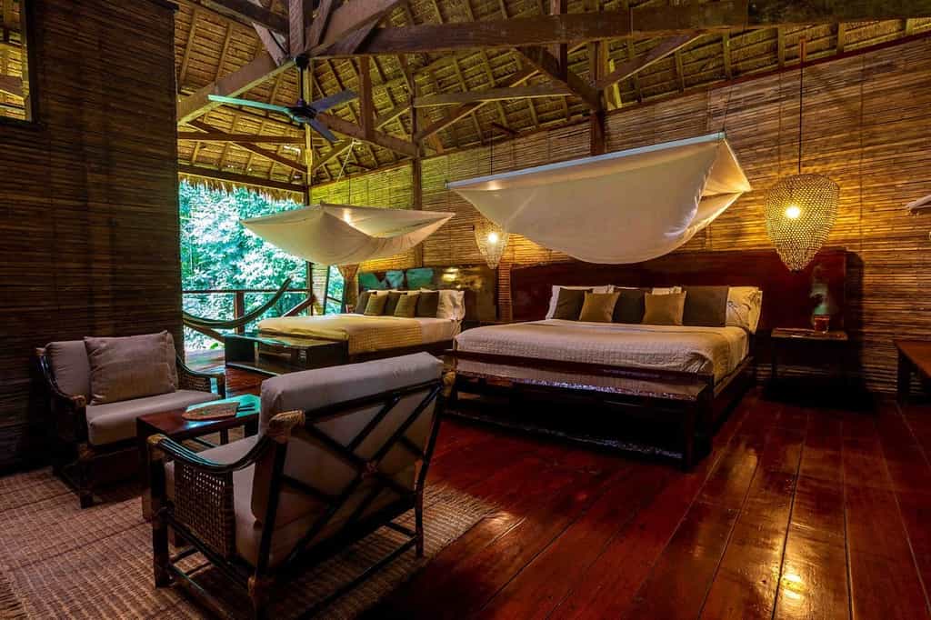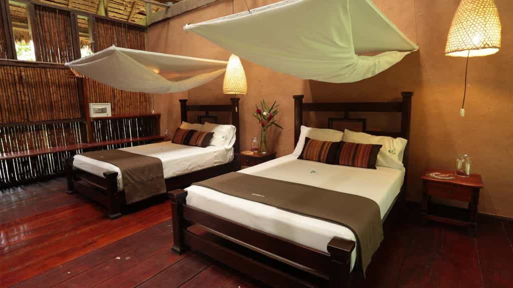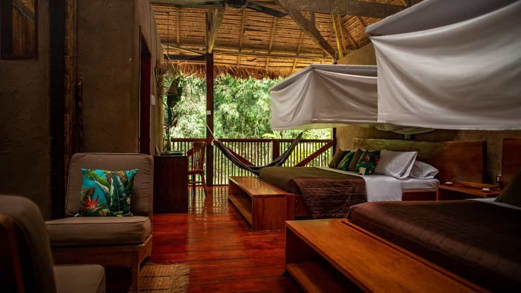 The airy buildings are built from traditional wood and palm fronds, with charming boardwalks to connect them all. The large dining room sits side by side with the jungle bar in the main building, where tart and tasty Pisco sours are always on offer. WiFi is available when electricity is on, which is a luxury in itself considering the location, and there are plenty of hammocks around for snoozing or reading a book from the library. Meals are casual and simple but delicious, with local ingredients always the hero.