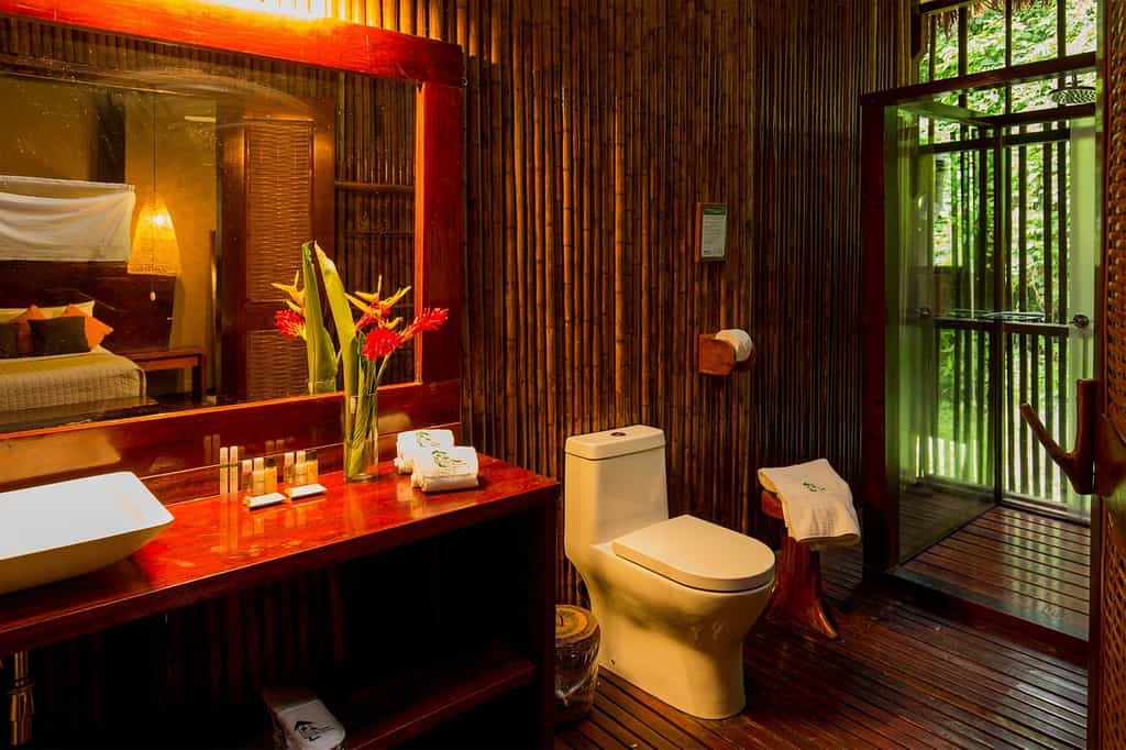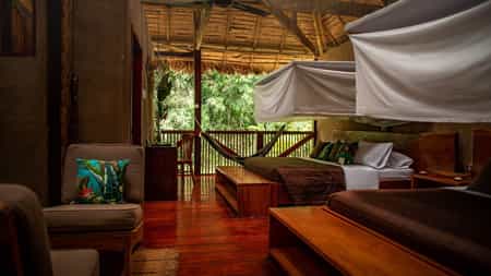 The rooms, built and decorated with local wood, are generous in size. The open wall faces the forest greenery and gives a true feeling of being immersed in the Amazon - and the in-room hammock is the perfect place to take in all the views and sounds. The beds of course have mosquito nets and the spacious bathrooms come with complimentary biodegradable toiletries. Electricity is limited to certain times of day and turned off by 10pm - just in time for bed.