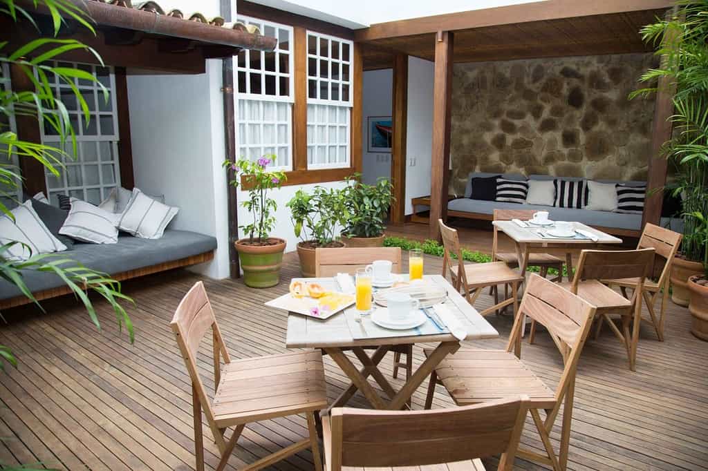 Pousada Literária is all high ceilings with exposed wooden beams and bright spaces filled with contemporary Brazilian art and design. Outside, the central garden courtyard is a splendidly peaceful place to spend an afternoon, while the heated pool is more social. For food and drink, the Quintal das Letras restaurant, run by Belgian chef Bertrand Materne, showcases caiçara cuisine using ingredients that arrive daily from Fazenda Bananal and the small bar serves adventurous craft cocktails. The property also houses Livraria das Marés, Paraty's most complete bookstore, and that glorious library, complete with a fireplace for the cooler evenings.