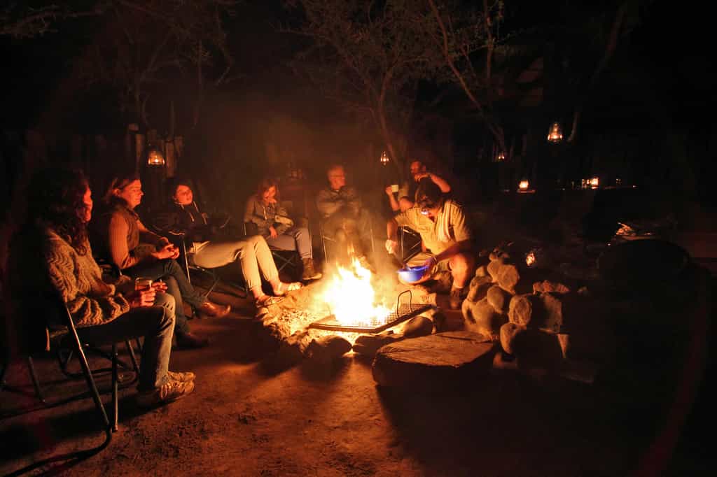 The camp’s focal point is an enchanting traditional boma created using centuries-old solid sneezewood timbers strewn with antelope horns in faithful replica of the bygone safari era, and sheltered by the sweeping branches of an enormous acacia tree. Part of the boma is thatched, with a cosy drinks area and dining space for times when the weather calls for cover. Delicious African-style bush cuisine is prepared on an open fire, with evenings lit by storm lanterns and candlelight.