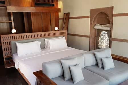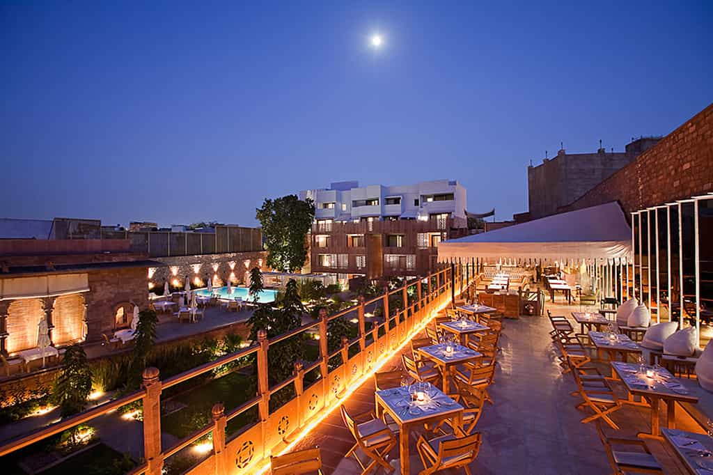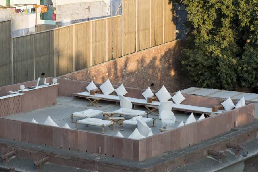 Rooms of all size and luxury level are available, ranging from the Garden Rooms with a secluded patio to the two-bedroom Heritage Suites with the old-world charm of a Rajput mansion, accompanied by an en-suite with dreamy cast-iron tub, cosy lounge and terrace. The room with a view at RAAS is the Stepwell Suite, named after its neighbour, the fascinating 1740 Stepwell. This well-appointed suite comes with two bedrooms, and a gleaming kitchenette combined with the original stonework.