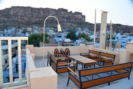 A melee of sky-blue buildings, medieval streets and the mightiest fort of them all, Mehrangarh.