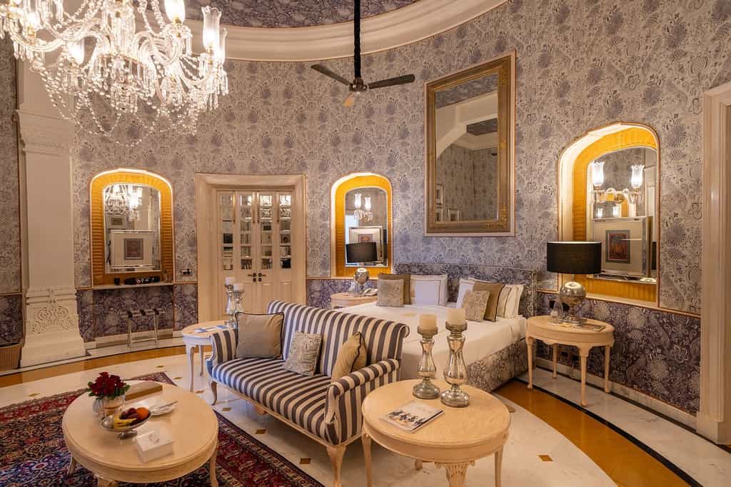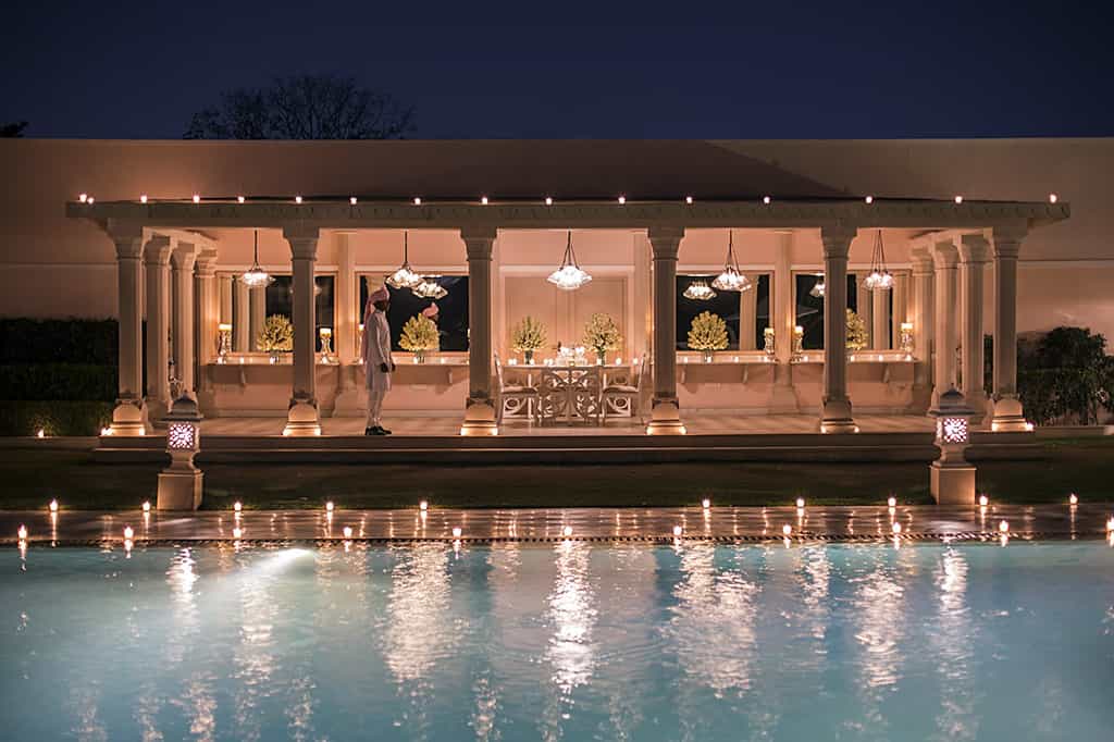 Set in well-manicured gardens and matching the classic rosy hue of Jaipur, Rajmahal Palace is a dream. Every room is a feast for the eyes, from the antique chandeliers to the jewel-bright furnishings. The palace offers dining in The Colonnade, Orient Occident, Rajmahal Cafe and the almost unreal 51 Shades of Pink, which makes for the perfect breakfast spot. Soak up the atmosphere with Ayurvedic treatments at the spa or a dip in the inviting Art Deco pool, surrounded by the soft glow of lanterns by night. You'll definitely feel like an aristocrat sipping tea under an airy gazebo.