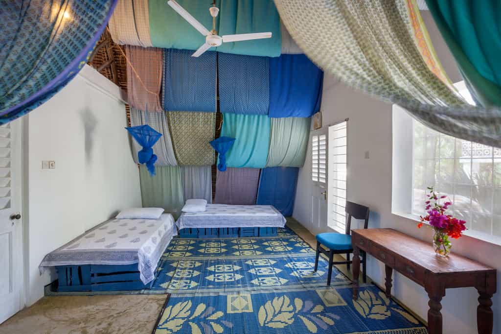 If there's one thing you've got at Ras Kikadini, it's space. The dining and living areas are large and airy, with en eclectic mix of custom-made and up-cycled furnishings, natural woods and local materials, an antique-wood dining table and a driftwood chandelier. Double-volume thatched ceilings and plenty of windows create an illuminated central space, and folding doors lead onto the gardens. The house is pet friendly, so Fido can come too.