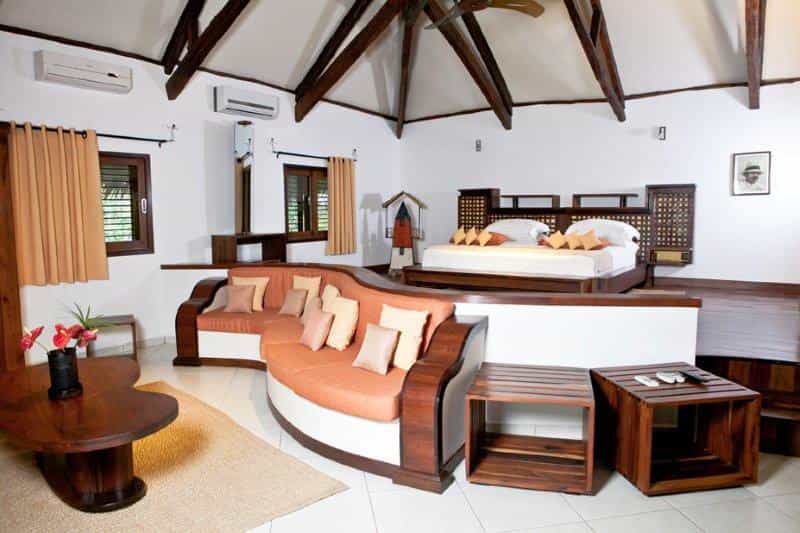 Accommodation is in beautifully appointed thatched bungalows – three with sea views – that are spread around the gardens for maximum privacy. The largest two offer a villa-style option, with two bedrooms and a separate lounge and dining area, perfect for families. Interiors have a fresh contemporary feel, with fluid organic lines, soothing natural tones and textures, and plenty of space. Bathrooms are en-suite, with showers and Jacuzzis. All have air-conditioning, ceiling fans, mini-bars and entertainment stations with wi-fi access.