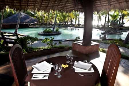 A vaulted, intricately thatched roof shades the gorgeous main area, with its spacious restaurant and bar facing the wide outdoor dining terrace and turquoise sea. An oasis-like swimming pool hugs the front of the hotel, with sun loungers dotted beneath the palms at the water’s edge. Secluded in the gardens is the spa and wellness centre, which offers offers a seductive range of treatments in its treatment rooms (there's also a steam room, a Jacuzzi, and a hair salon).