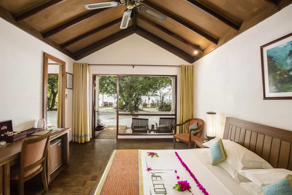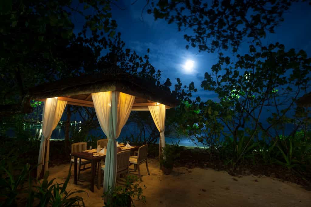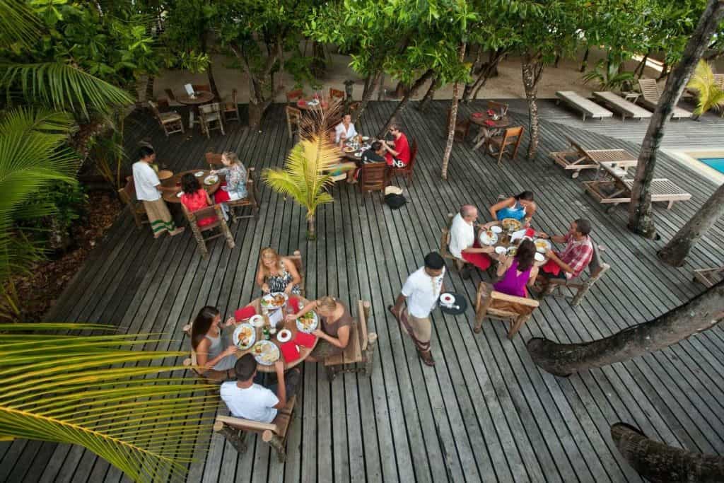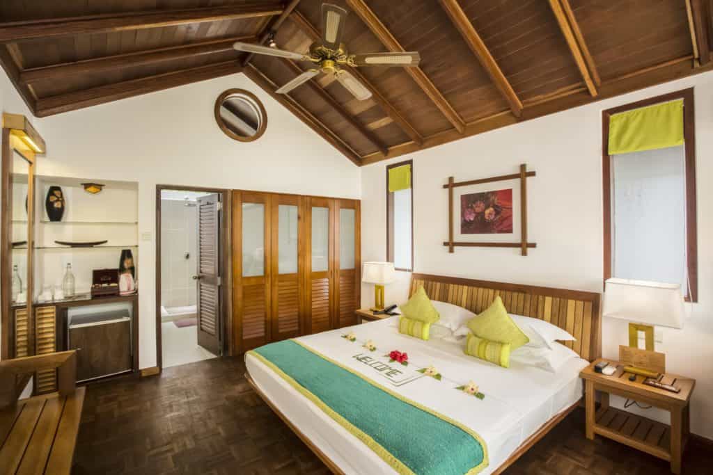 Rooms are air-conditioned and set amid tropical foliage fringing a long expanse of powder soft beach or on stilts over the clear blue lagoon. There are five restaurants and five bars, poolside and beachfront.