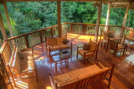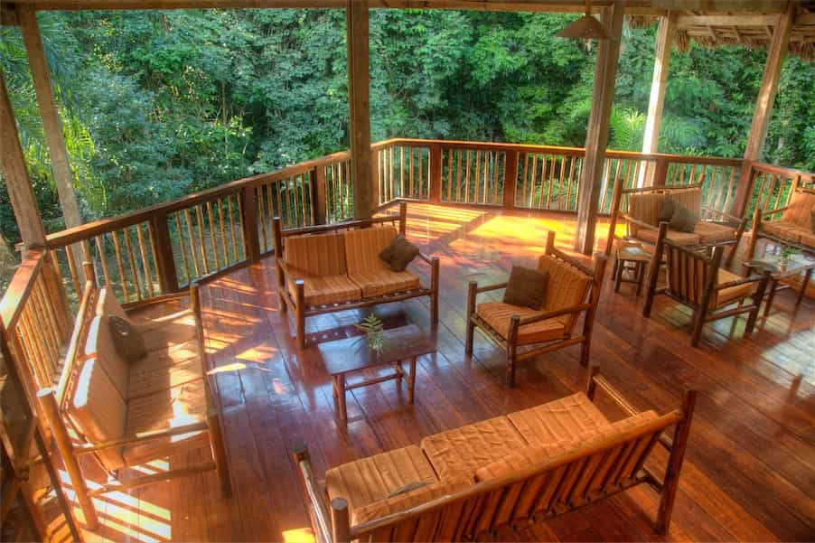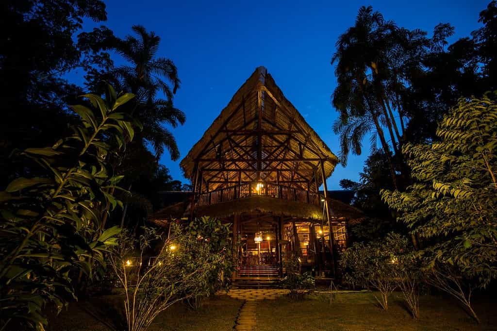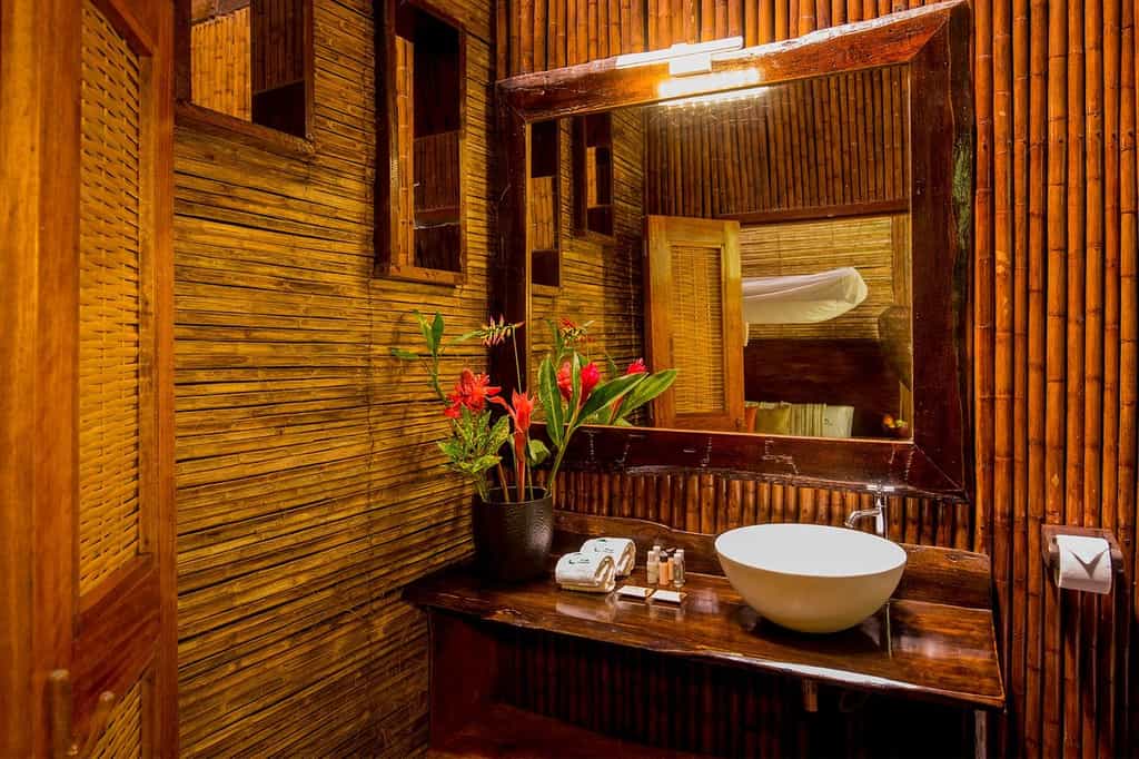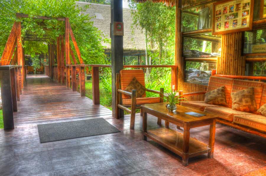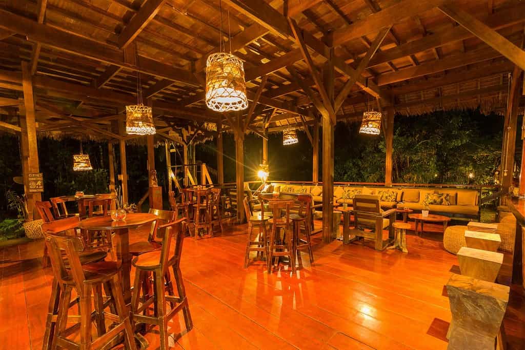 The lodge is impressive, especially when you consider it was built deep in the rainforest. The main building stands two-storeys tall and is home to all the main areas: the dining room, where buffet-style meals are enjoyed in long social tables, the bar offering an array of local beers, wine and cocktails, comfy and spacious lounging areas, a library, and even a gift shop. Rustic elegance is the name of the game, and wood and thatched roofs and warmly-lit wooden boardwalks connect everything together.